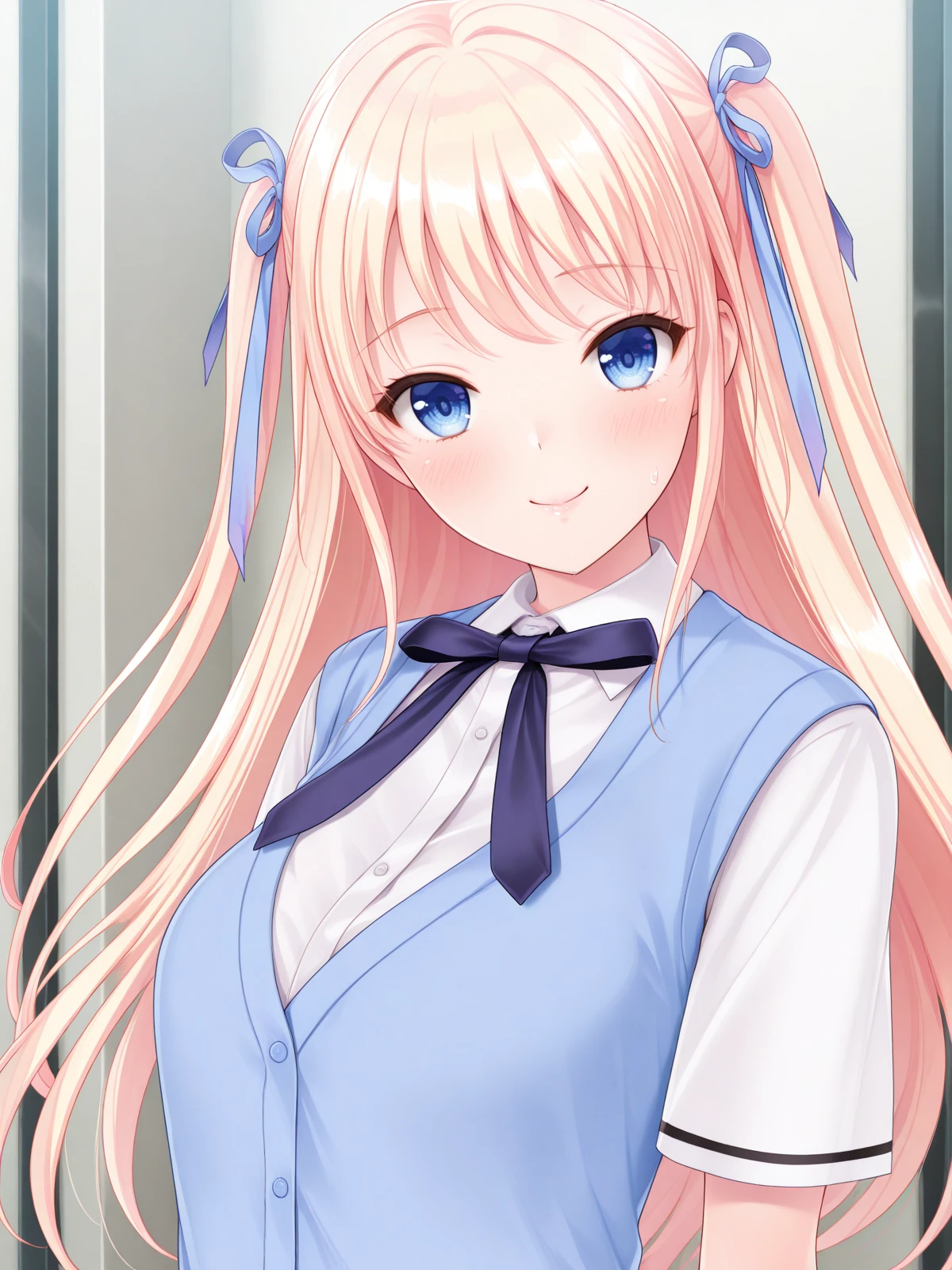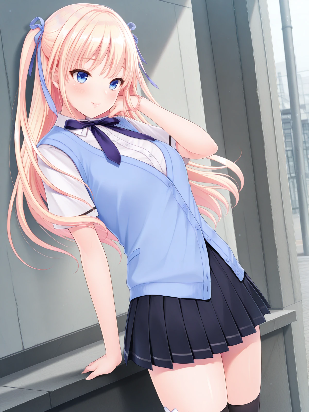 school uniform, white shirt, neck ribbon, cardigan vest, pleated skirt, thighhighs,