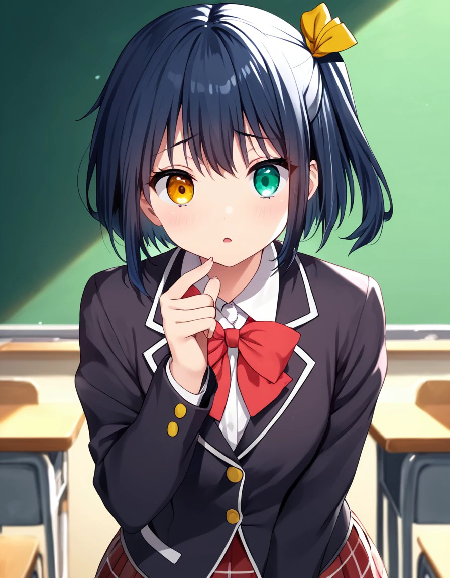 1girl, takanashi rikka, short hair, one side up, black hair, green eyes, yellow hair ribbon, school uniform, black blazer, red bowtie, red skirt, plaid skirt, pleated skirt