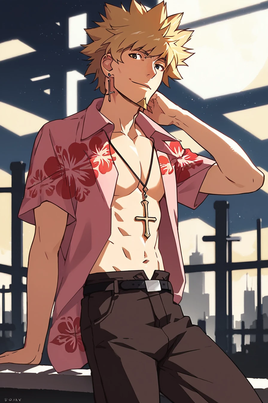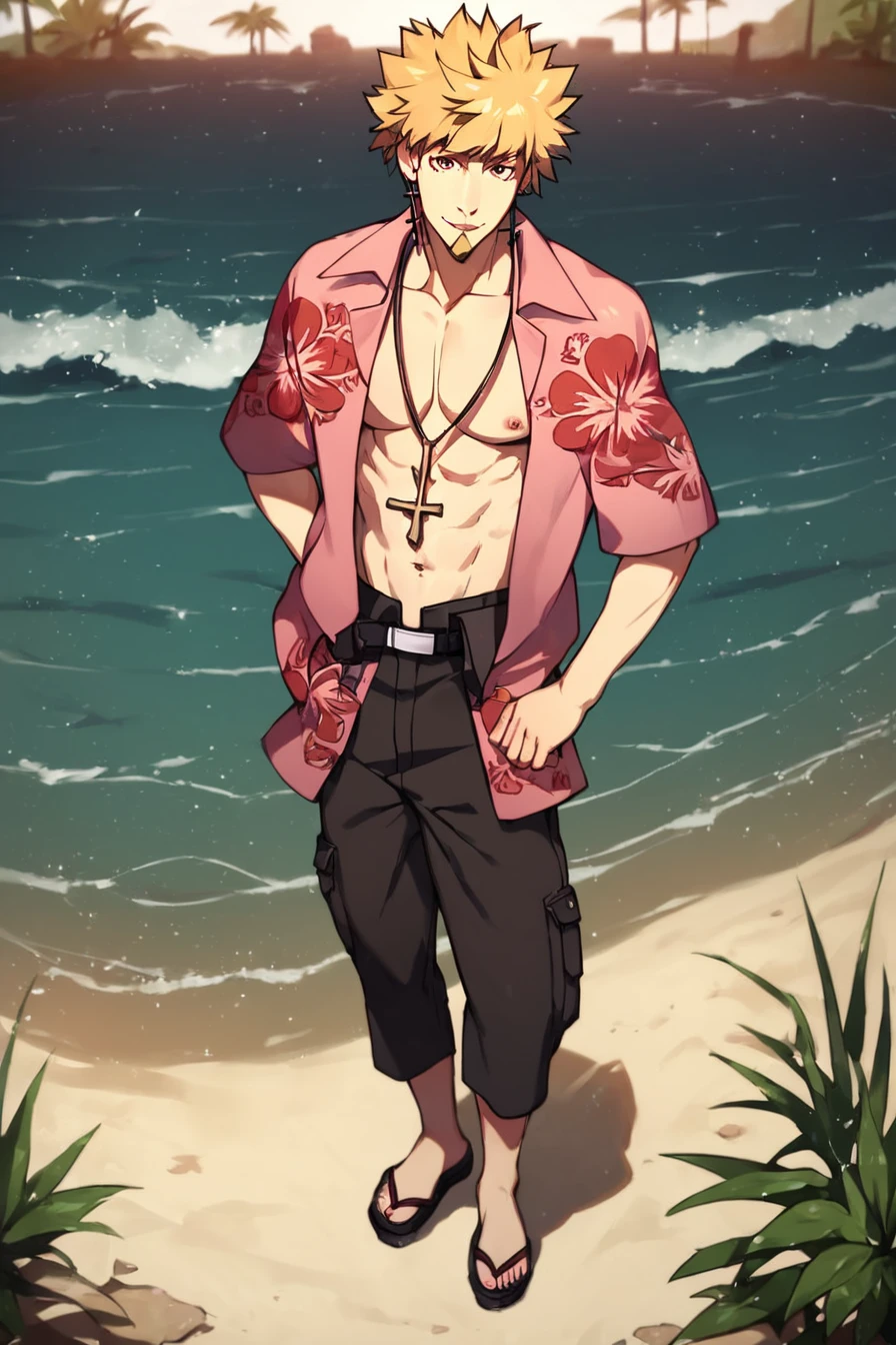 cross necklace, cross earring, hawaiian shirt, black belt, black cargo shorts