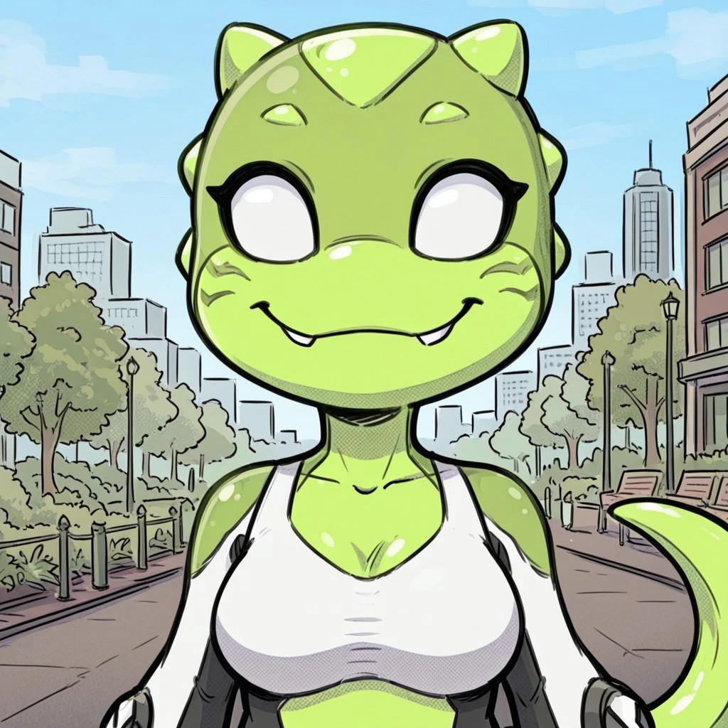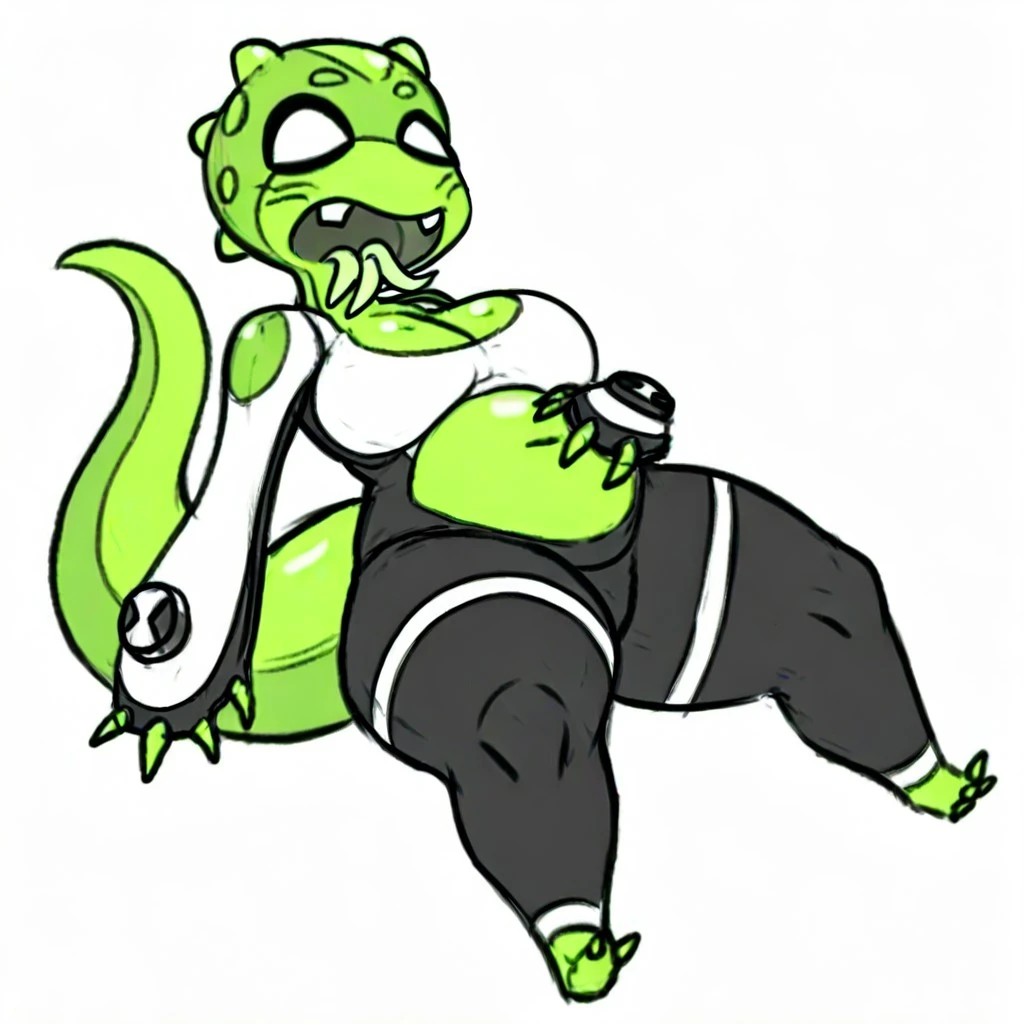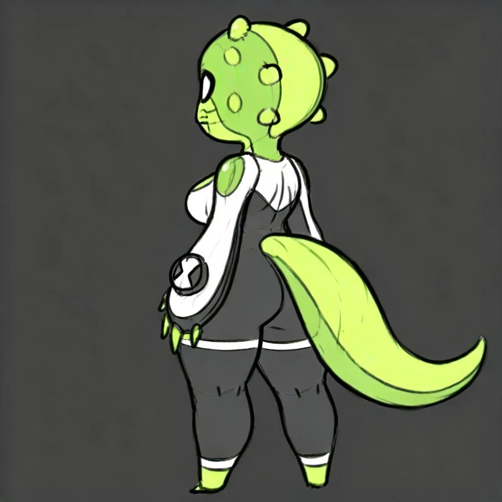 UC(character), female, alien, green body, W and B body suit, no pupils, tail,