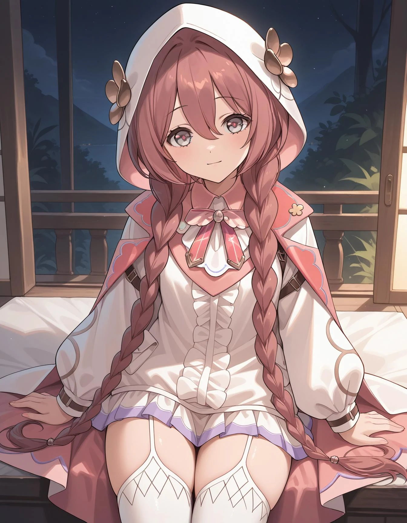 vspomokacos,white dress,center frills,puffy long sleeves,pink neck bow,white skirt,miniskirt,white thighhigh,straps thighhigh,cape,hood,hood up,