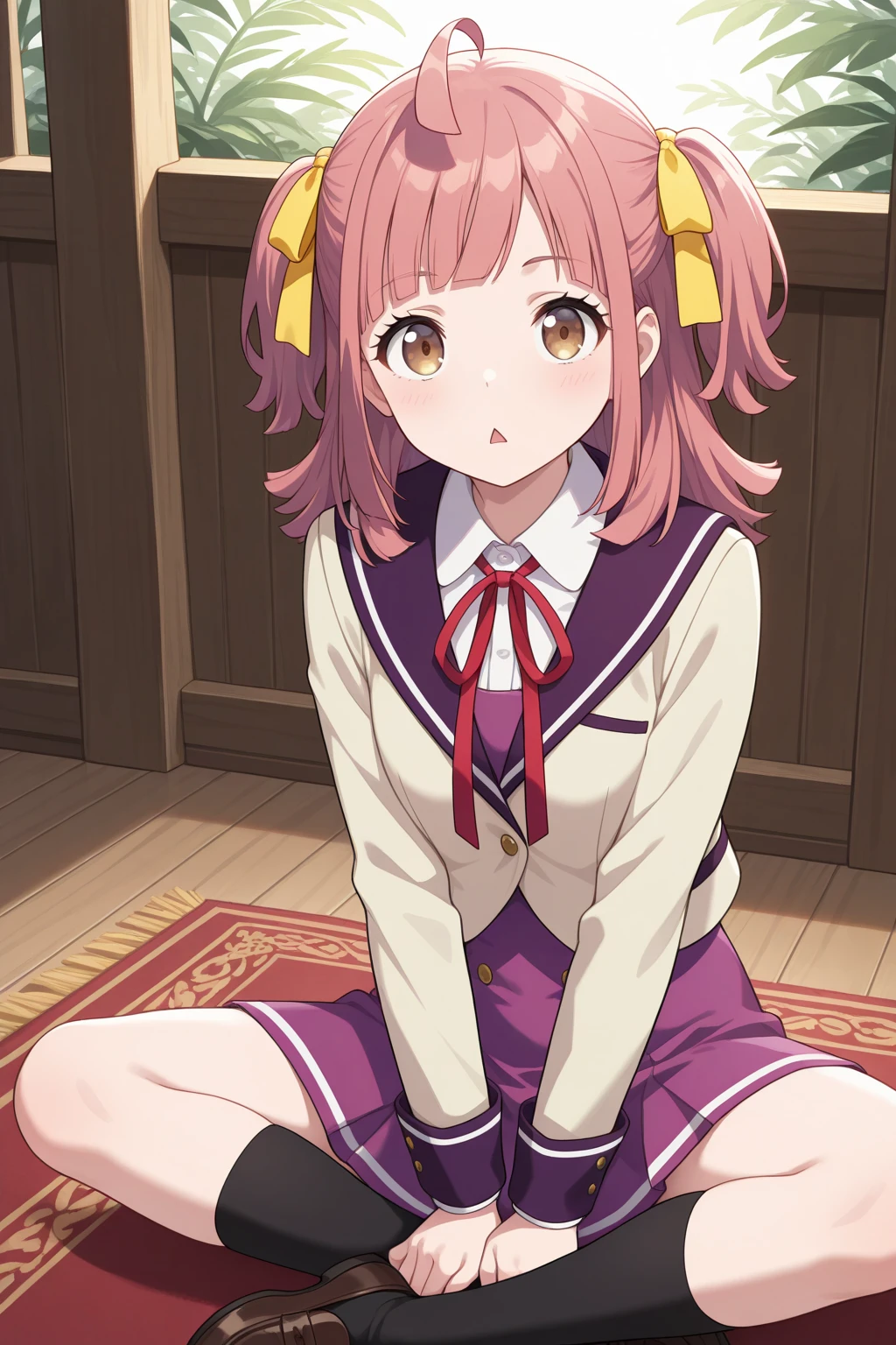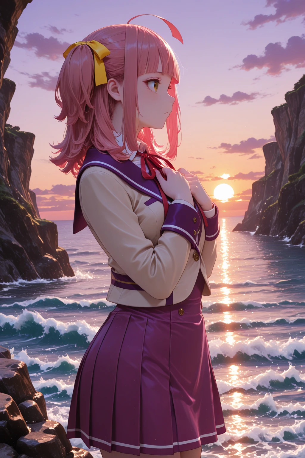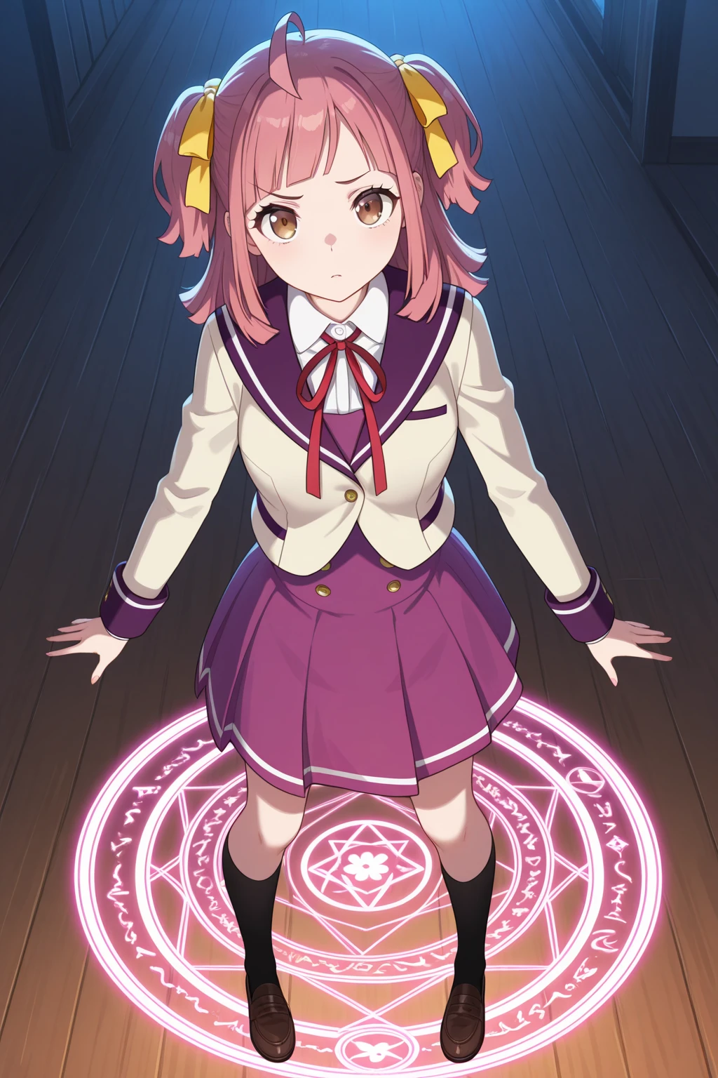 トリガーワード:A_Minoa, pink hair, medium hair, ahoge, two side up, yellow hair ribbon, blunt bangs, brown eyes, school uniform, white shirt, collared shirt, red neck ribbon, brown jacket, sailor jacket, purple sailer collar, cropped jacket, long sleeves, purple dress追加:black socks, brown loafers