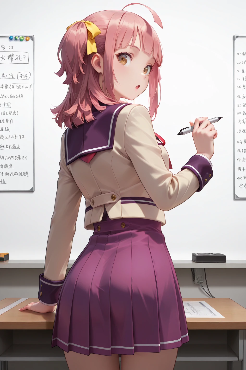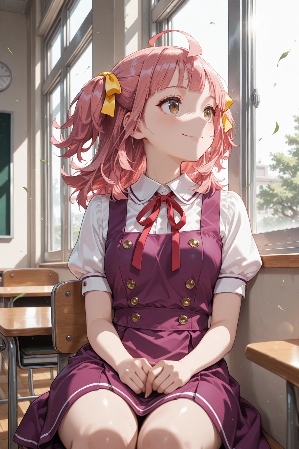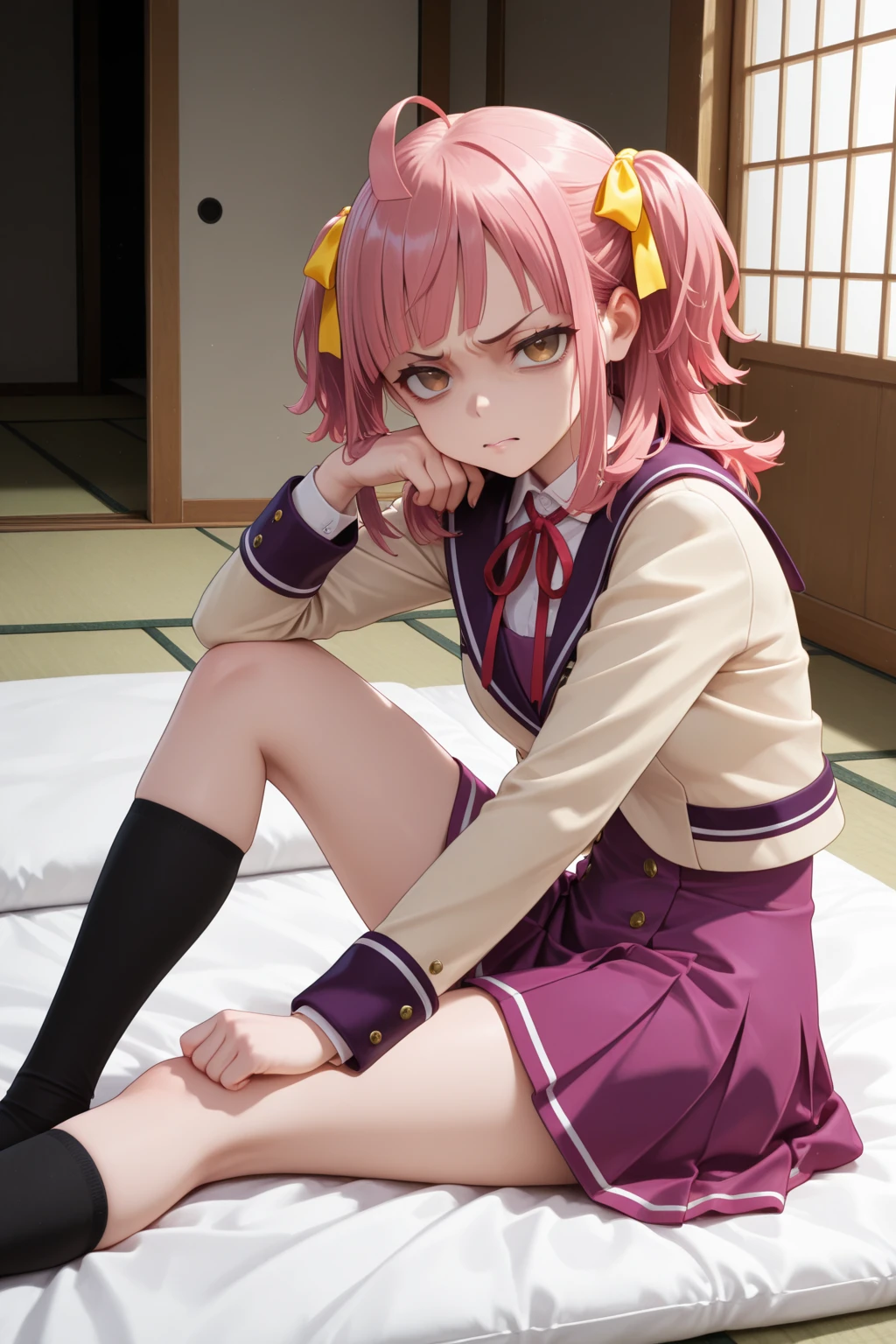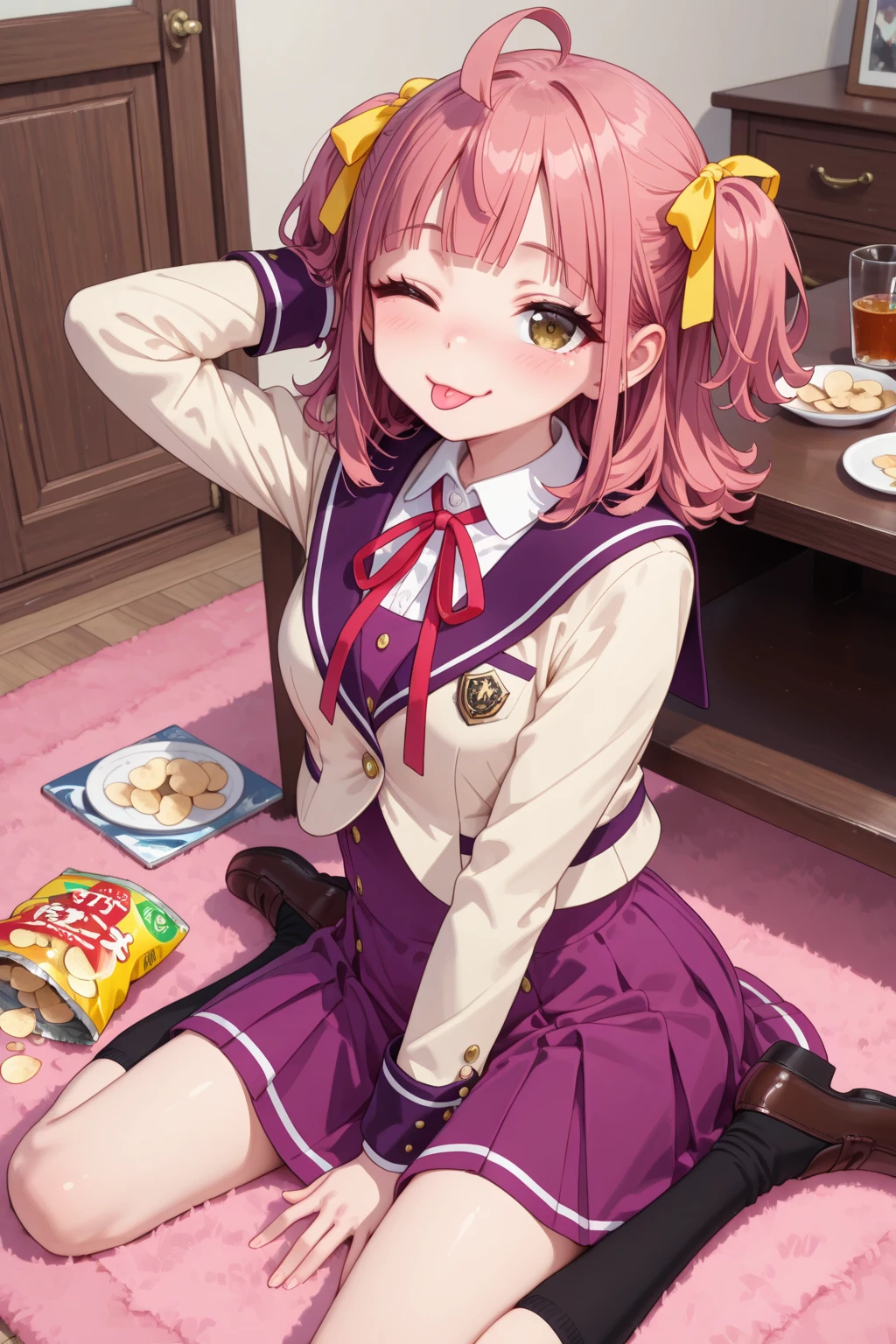 トリガーワード:A_Minoa, pink hair, medium hair, ahoge, two side up, yellow hair ribbon, blunt bangs, brown eyes, school uniform, white shirt, collared shirt, red neck ribbon, brown jacket, sailor jacket, purple sailer collar, cropped jacket, long sleeves, purple dress追加:black socks, brown loafers