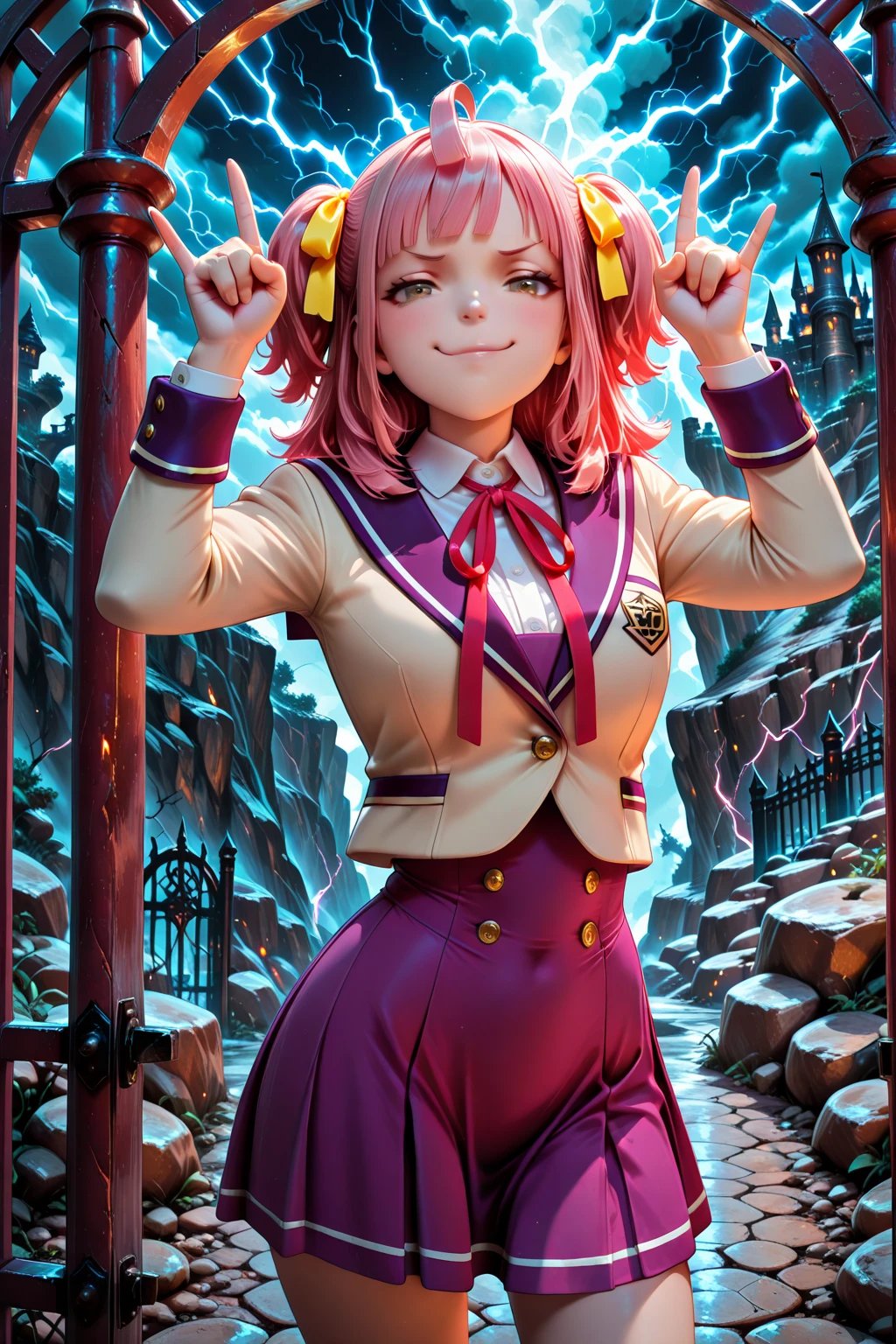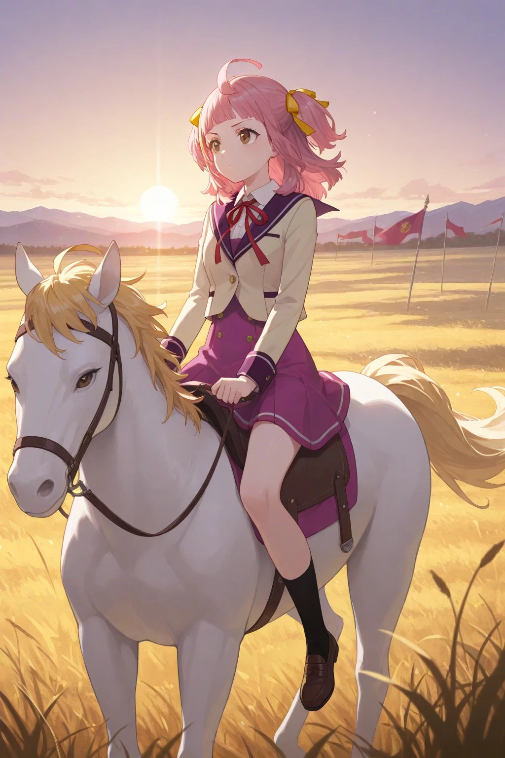 Trigger word: A_Minoa, pink hair, medium hair, ahoge, two side up, yellow hair ribbon, blunt bangs, brown eyes, school uniform, white shirt, collared shirt, red neck ribbon, brown jacket, sailor jacket, purple sailer collar, cropped jacket, long sleeves, purple dressAddition: black socks, brown loafersDescription