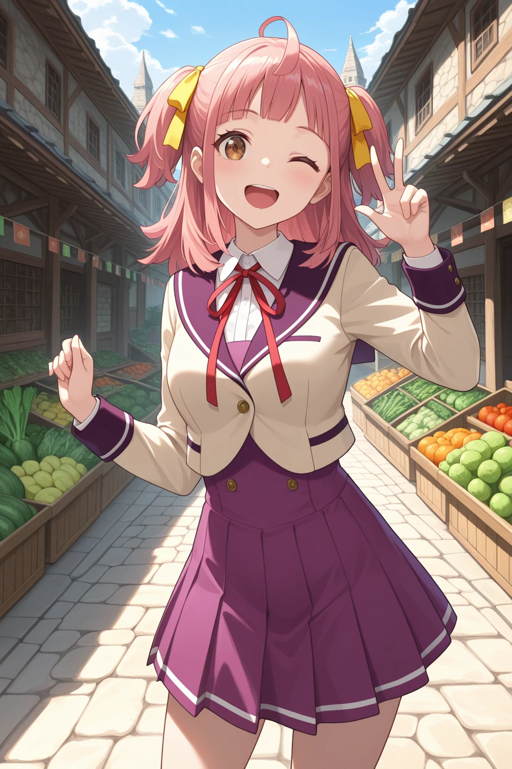 A_Minoa, pink hair, medium hair, ahoge, two side up, yellow hair ribbon, blunt bangs, brown eyes, school uniform, white shirt, collared shirt, red neck ribbon, brown jacket, sailor jacket, purple sailer collar, cropped jacket, long sleeves, purple dress