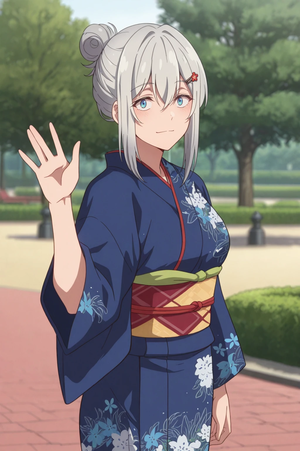 Kimono: 1girl, s41t0uineJun, grey hair, medium hair, hair between eyes, blue eyes, hair clip, sidelooks, hair bun, blue kimono,