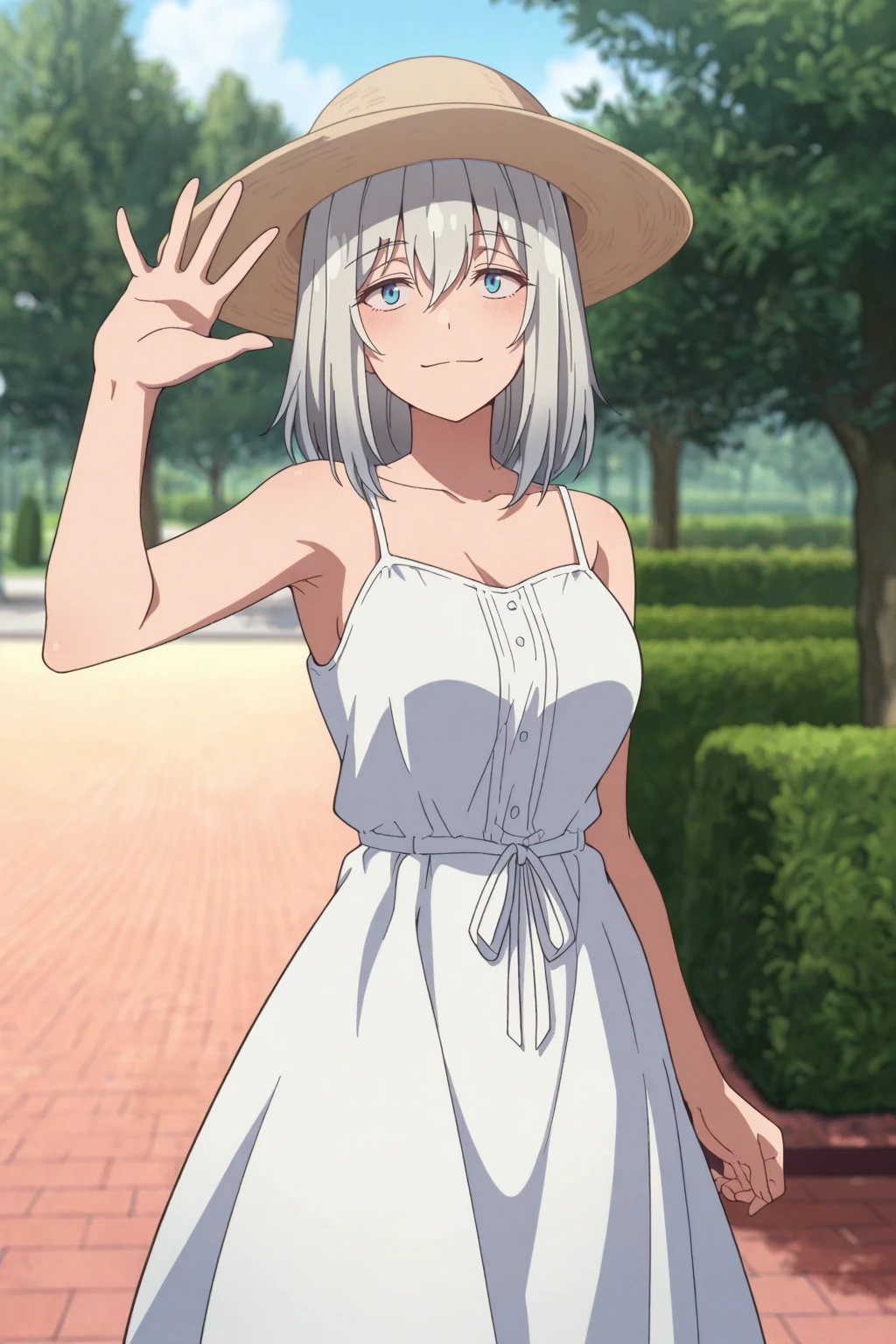 Appearance: grey hair, medium hair, hair between eyes, blue eyes