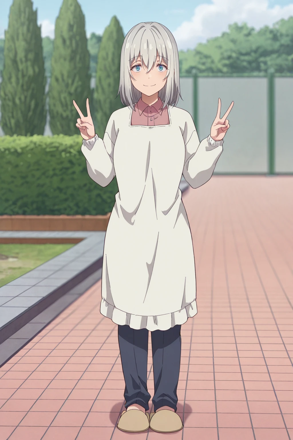 Default: 1girl, s41t0uineJun, grey hair, medium hair, hair between eyes, blue eyes, apron, kappougi, pink shirt, collared shirt, pants,