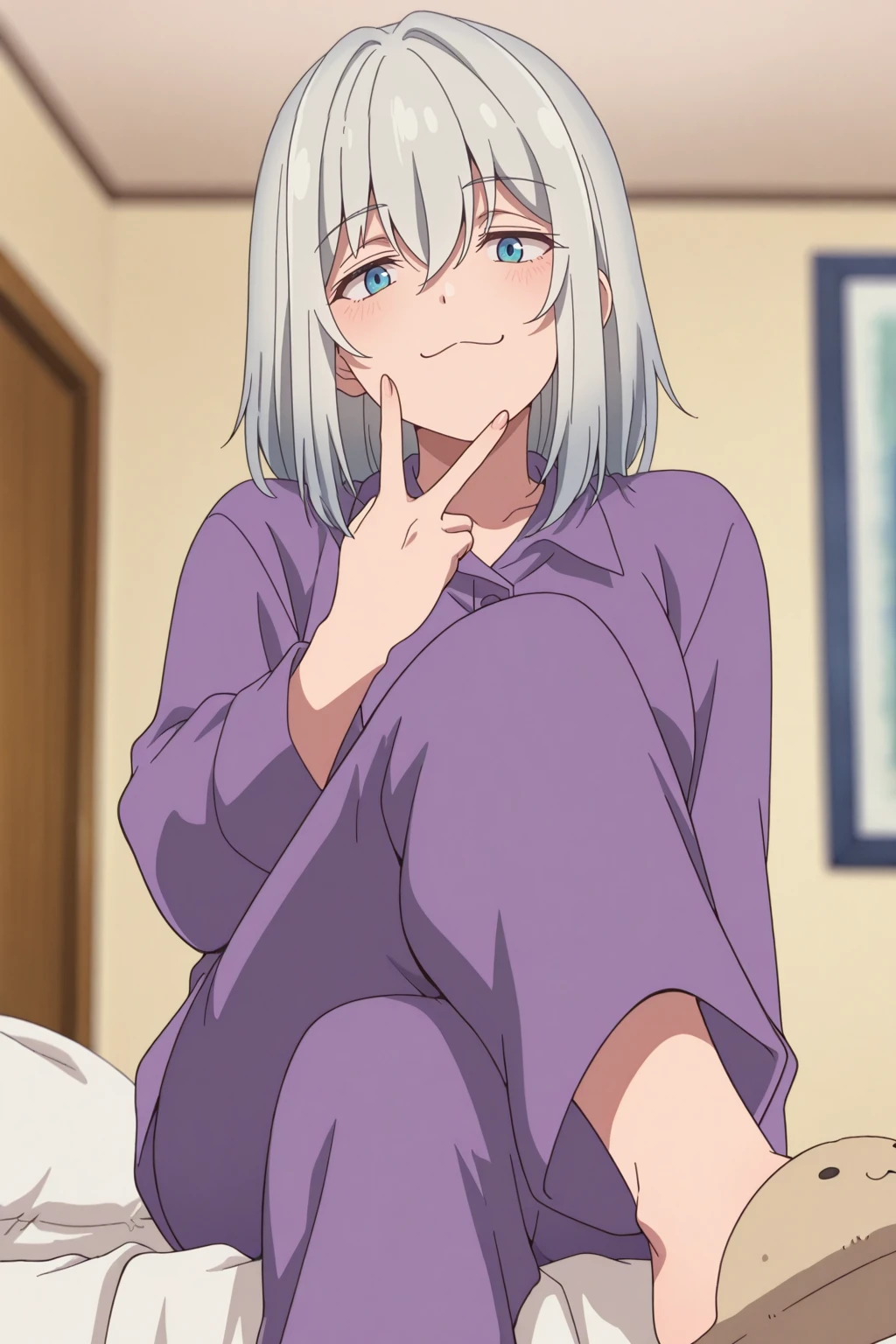 s41t0uineJun, grey hair, medium hair, hair between eyes, blue eyes, purple pajamas, pants, shirt,