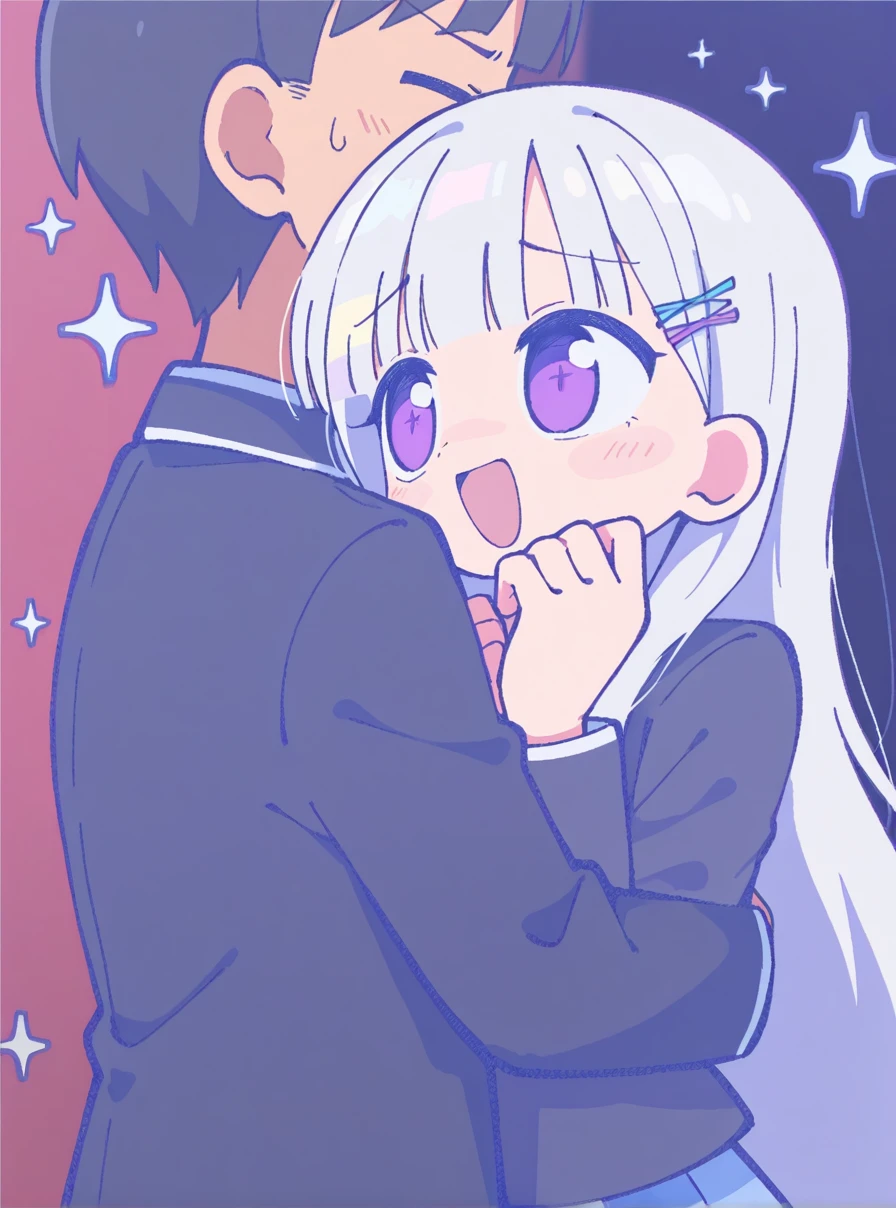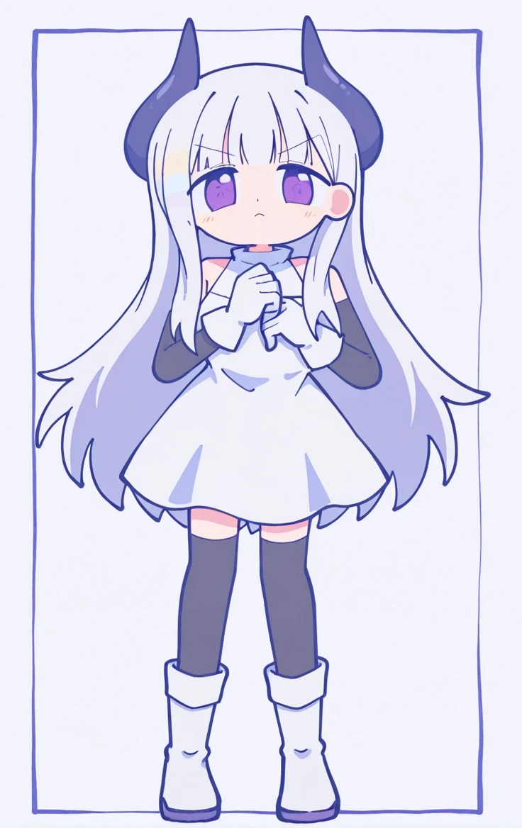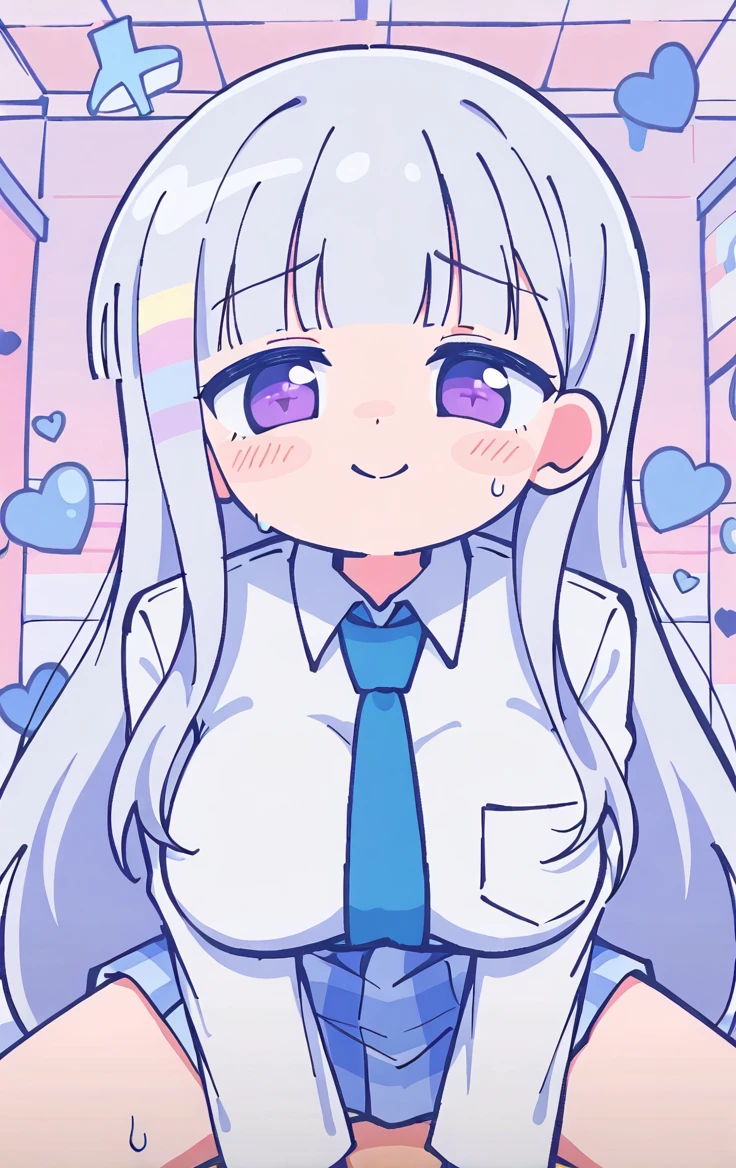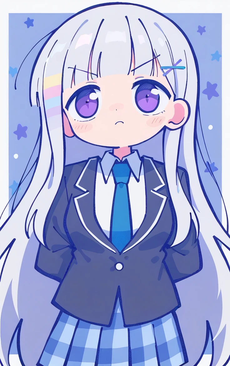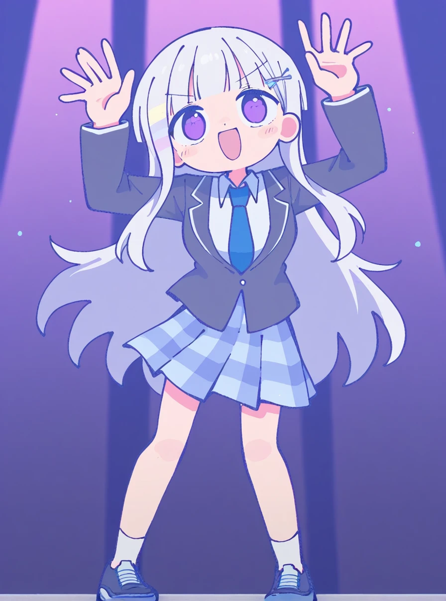 tags: 1girl,white hair, long hair, hair ornament, bangs, purple eyes, collared shirt, blue necktie, black jacket, white socks, skirt, shoes,