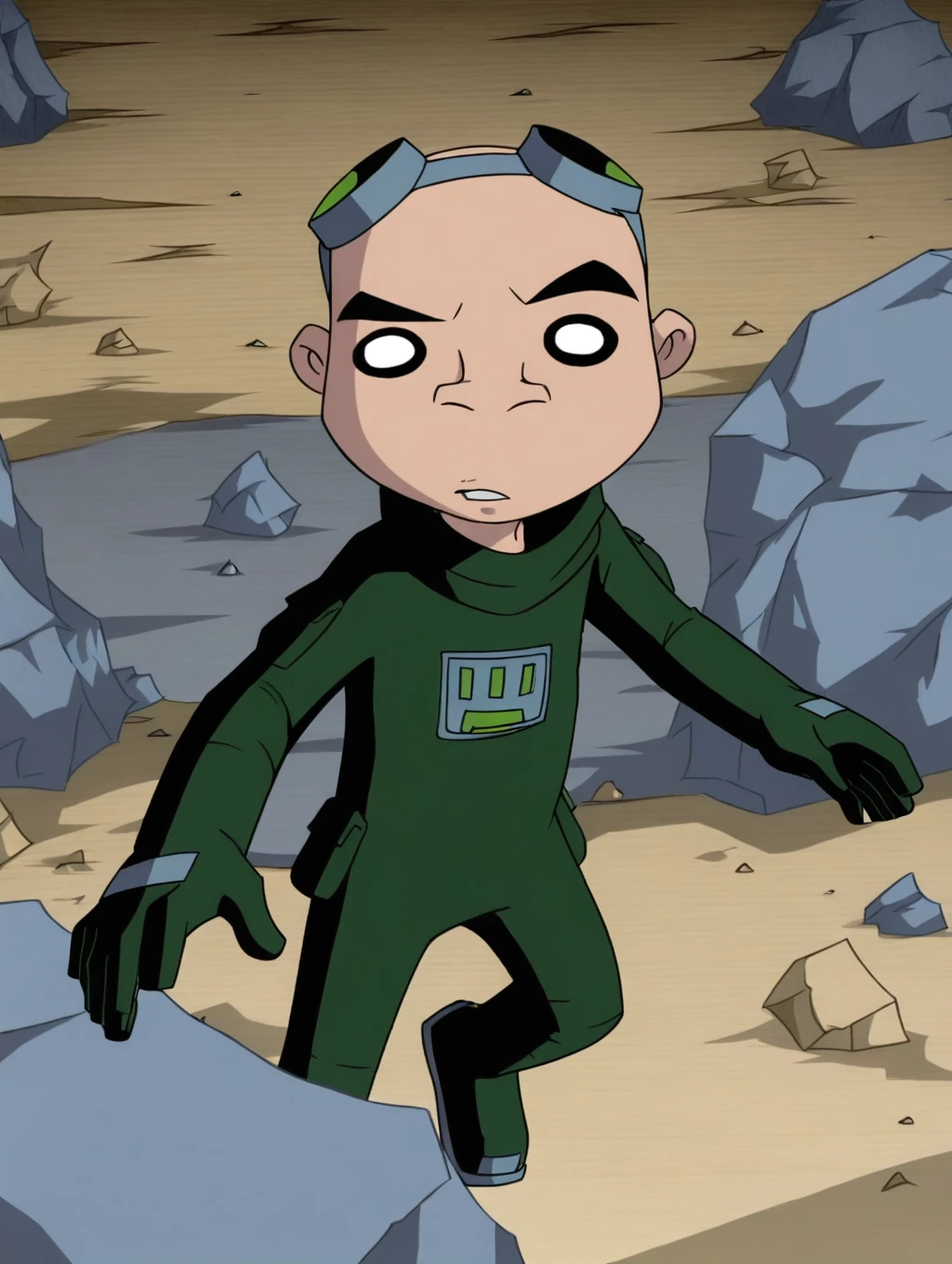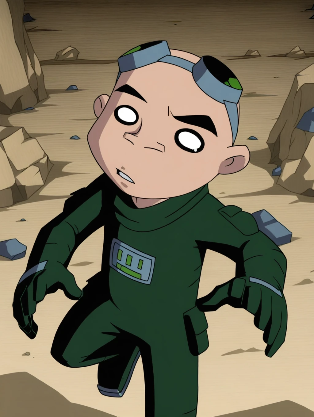 <lora:Gizmo-TT-V1-Pony:1>,gizmo-tt, 1boy, male focus, solo, goggles on head, gloves, green bodysuit, bald,