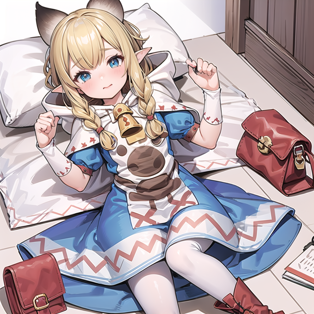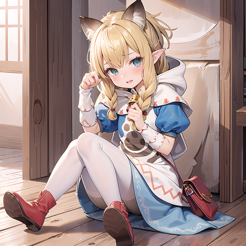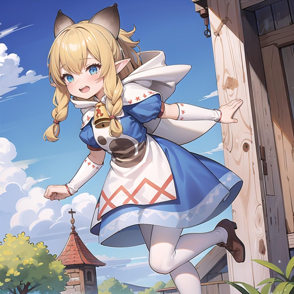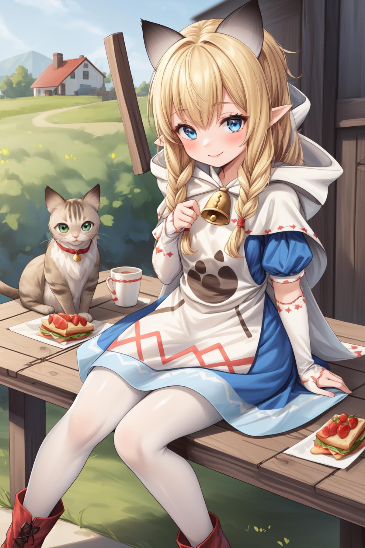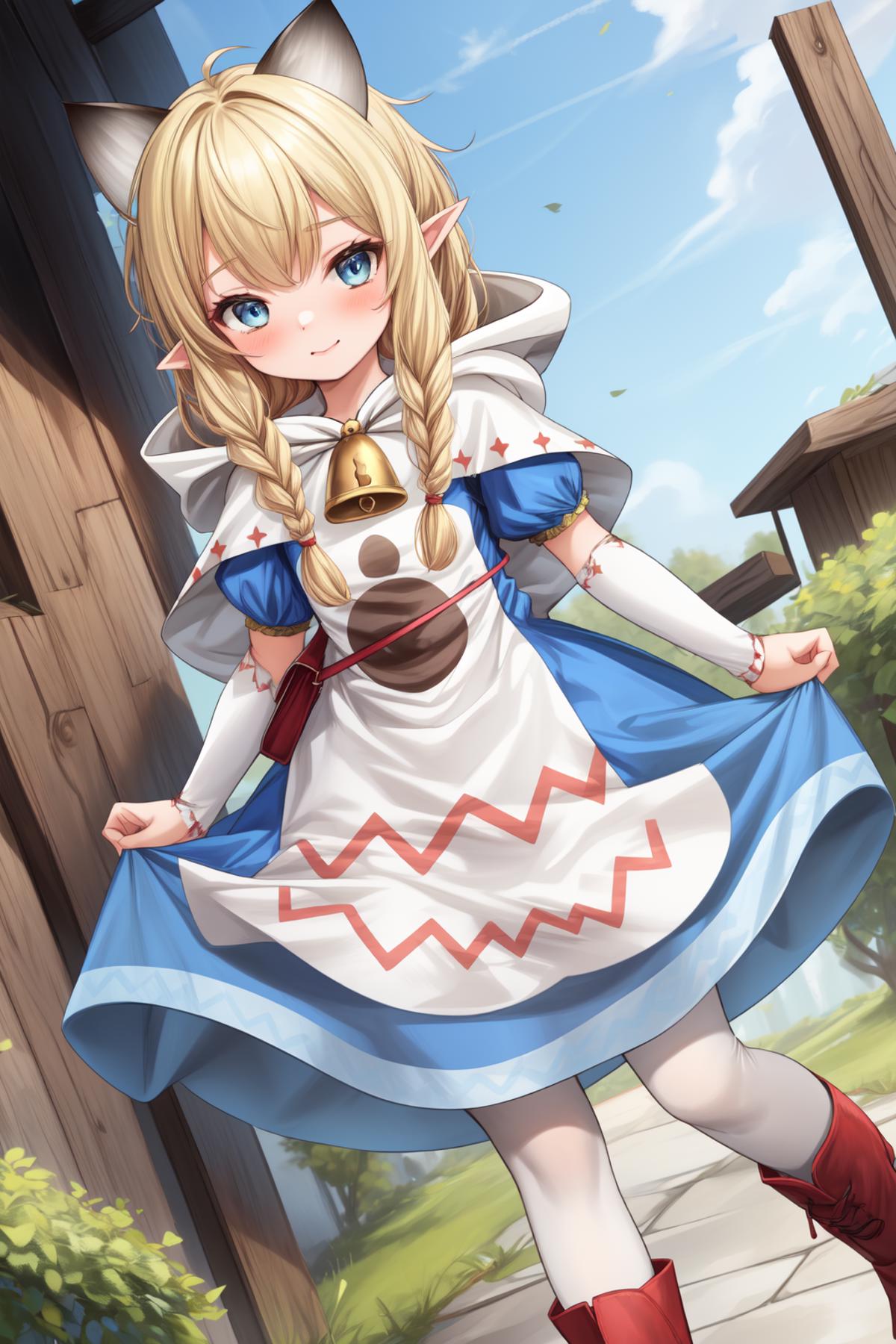 meowstress, twin braids, blue dress, capelet, apron, paw print, bell, hood, puffy short sleeves, shoulder bag, white pantyhose, boots