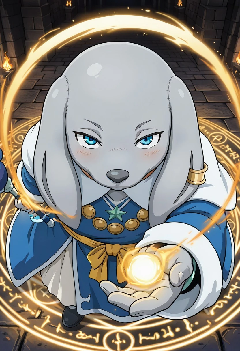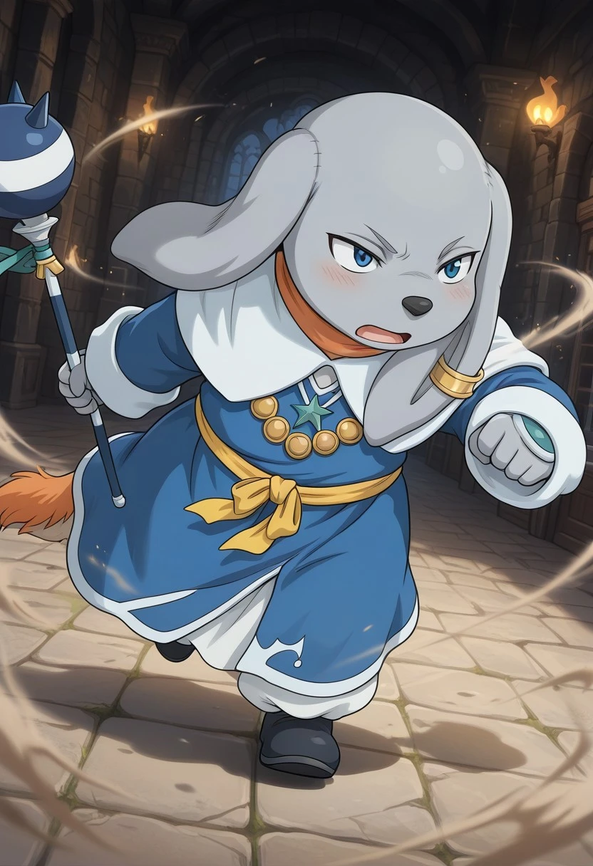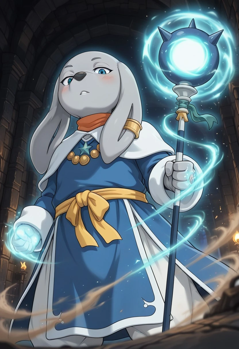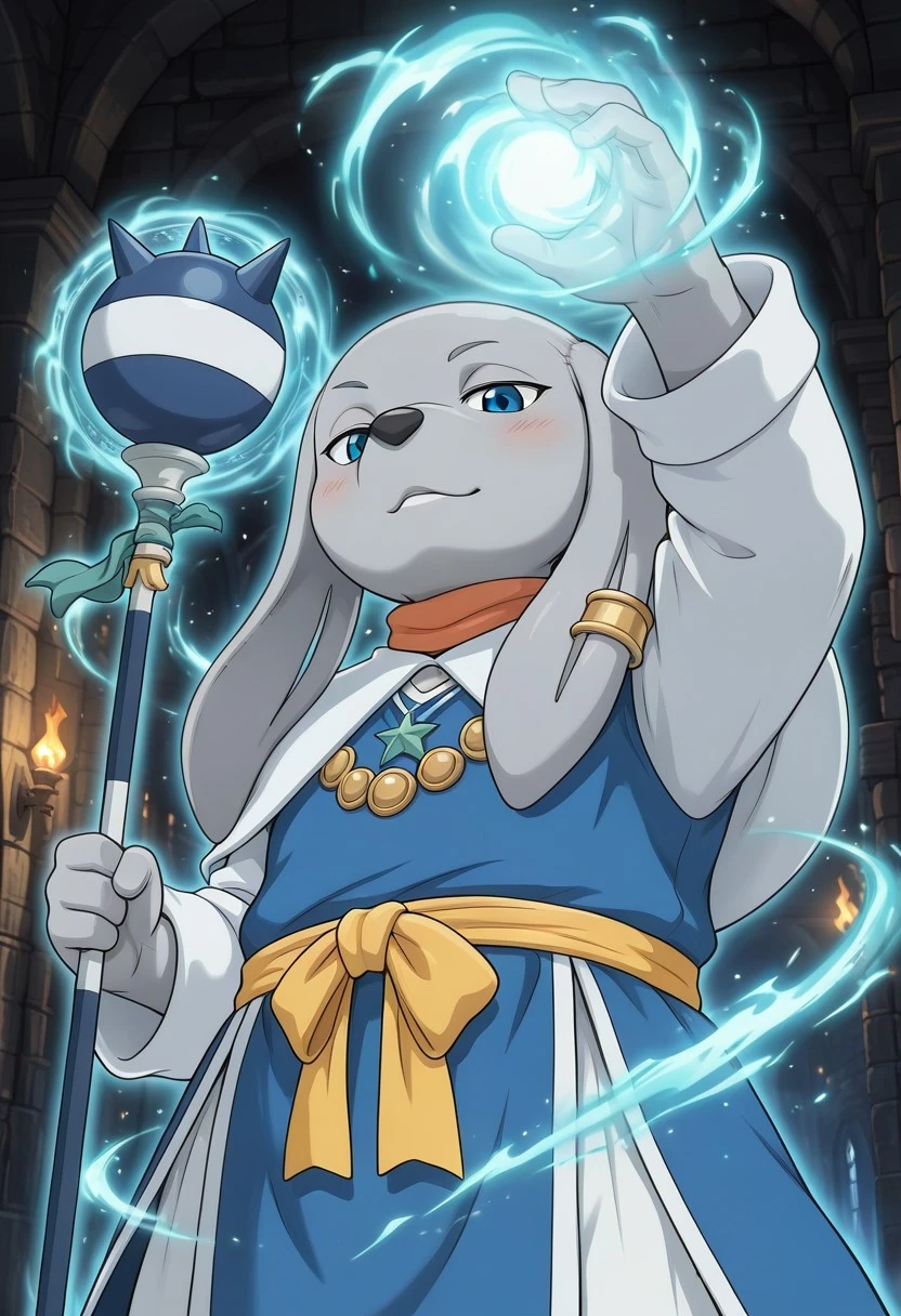 gray skin, blue eyes, gray skin, colored skin, blue robe, blush, determined expression, cool face