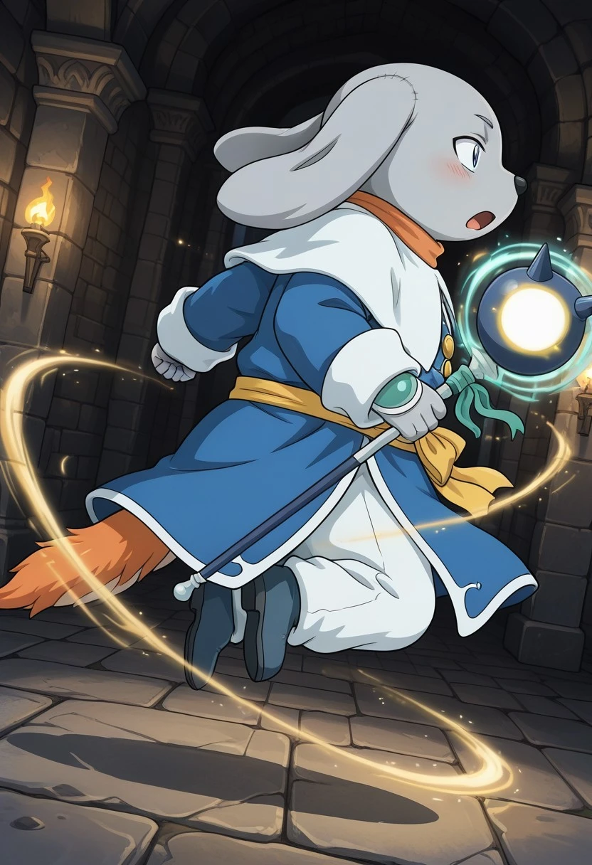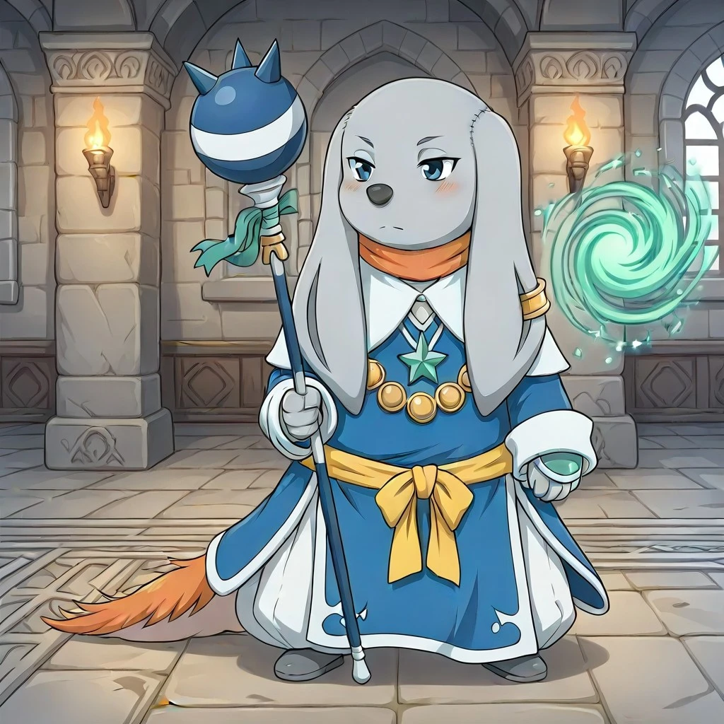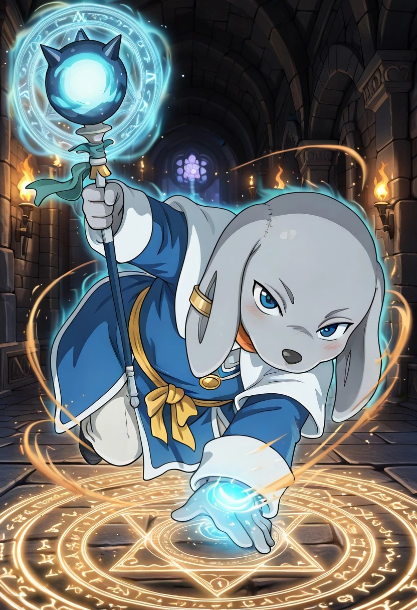 gray skin, blue eyes, gray skin, colored skin, blue robe, blush, determined expression, cool face