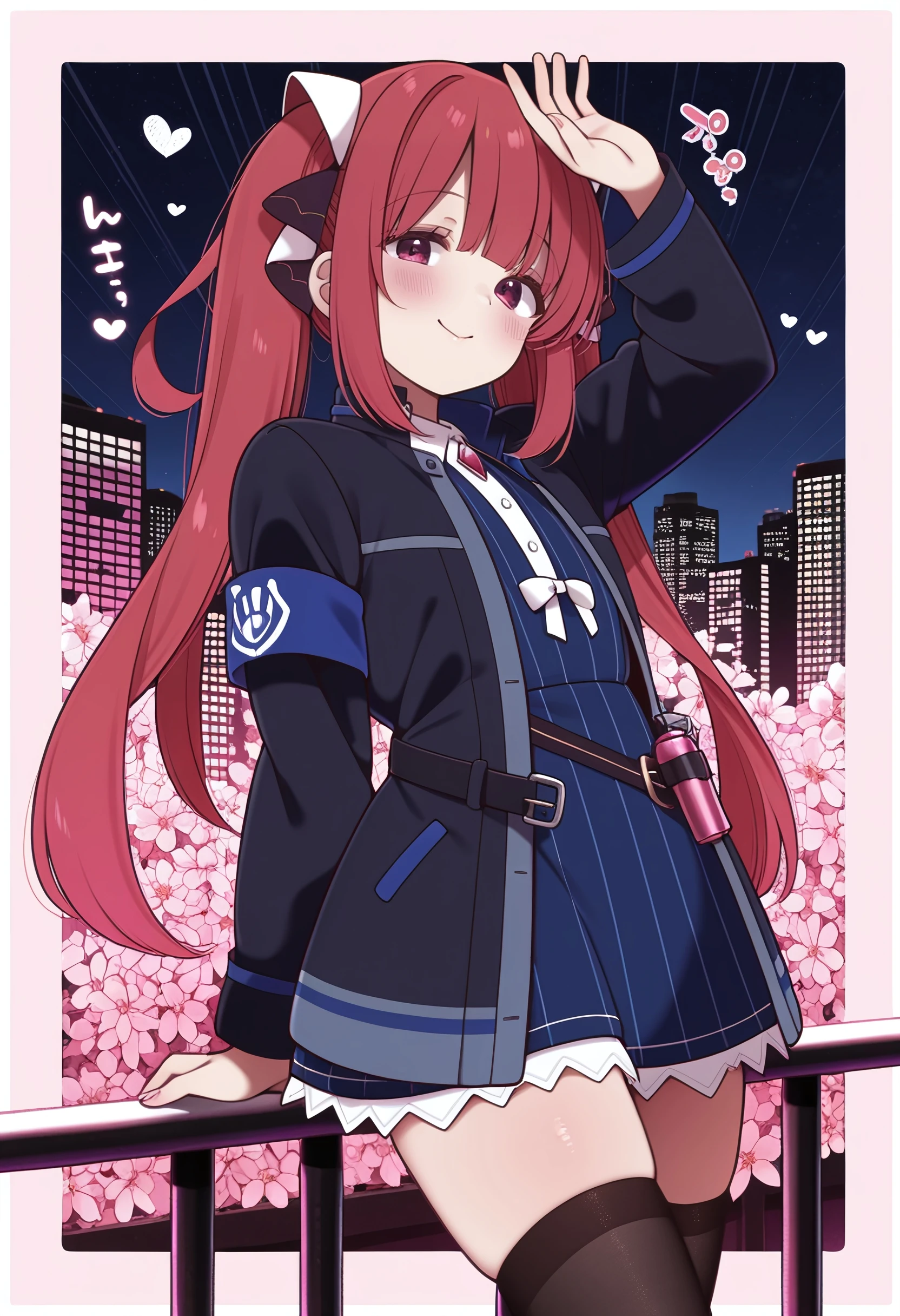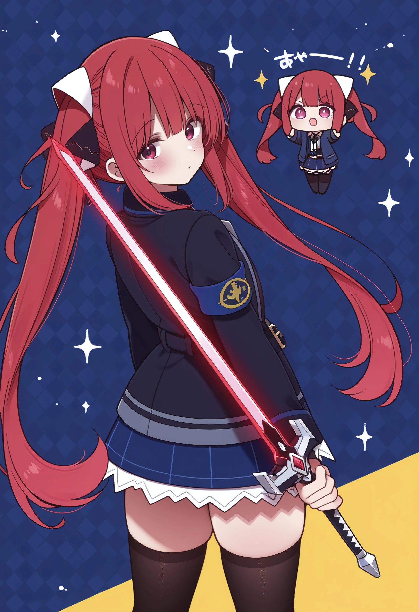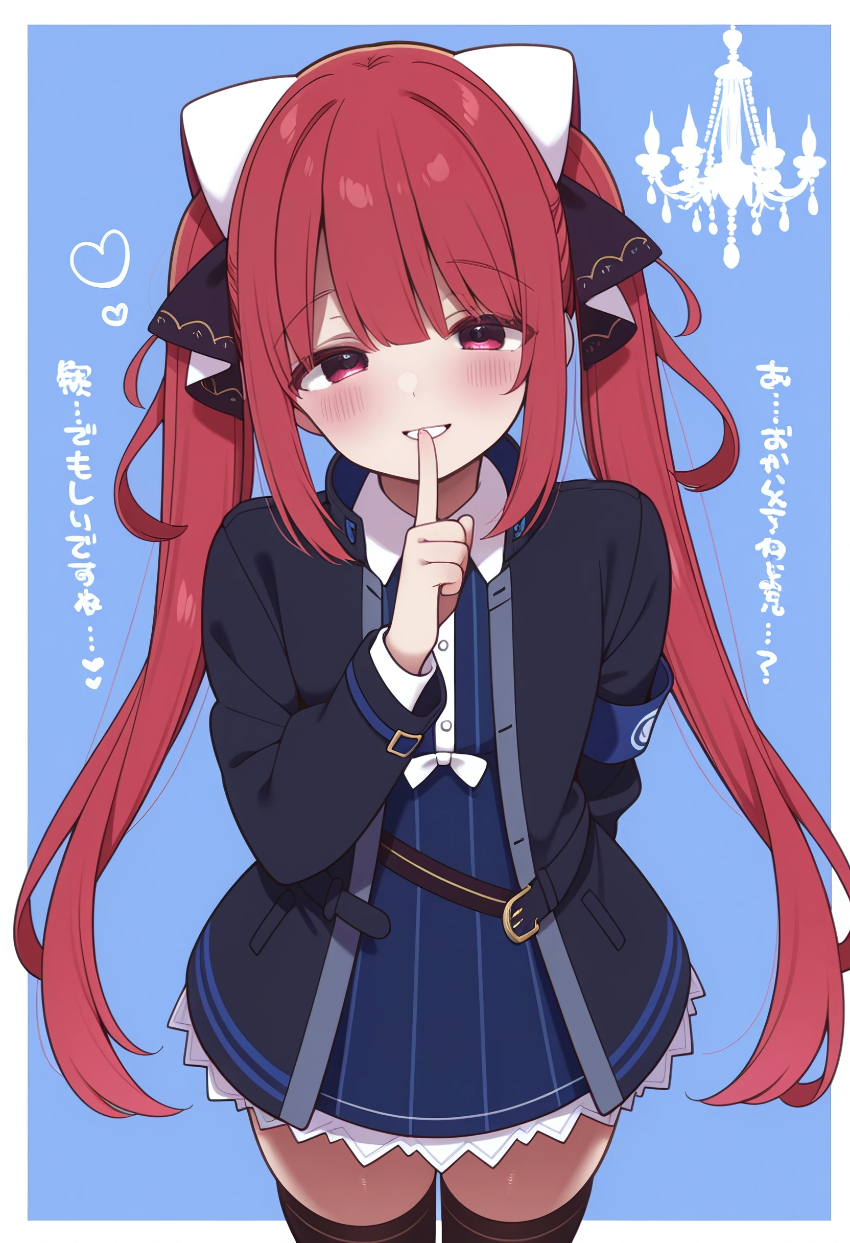 sofia_claudel, long_hair, blunt_bangs, twintails, hair_ornament, hair_ribbon, red_hair, red_eyes, pink_eyes, flat_chest, collared_shirt, blue_skirt, open_jacket, black_jacket, armband, zettai_ryouiki, black_thighhighs