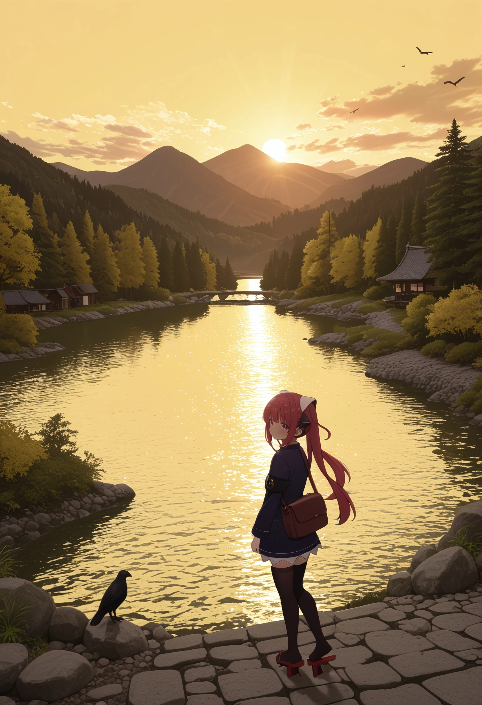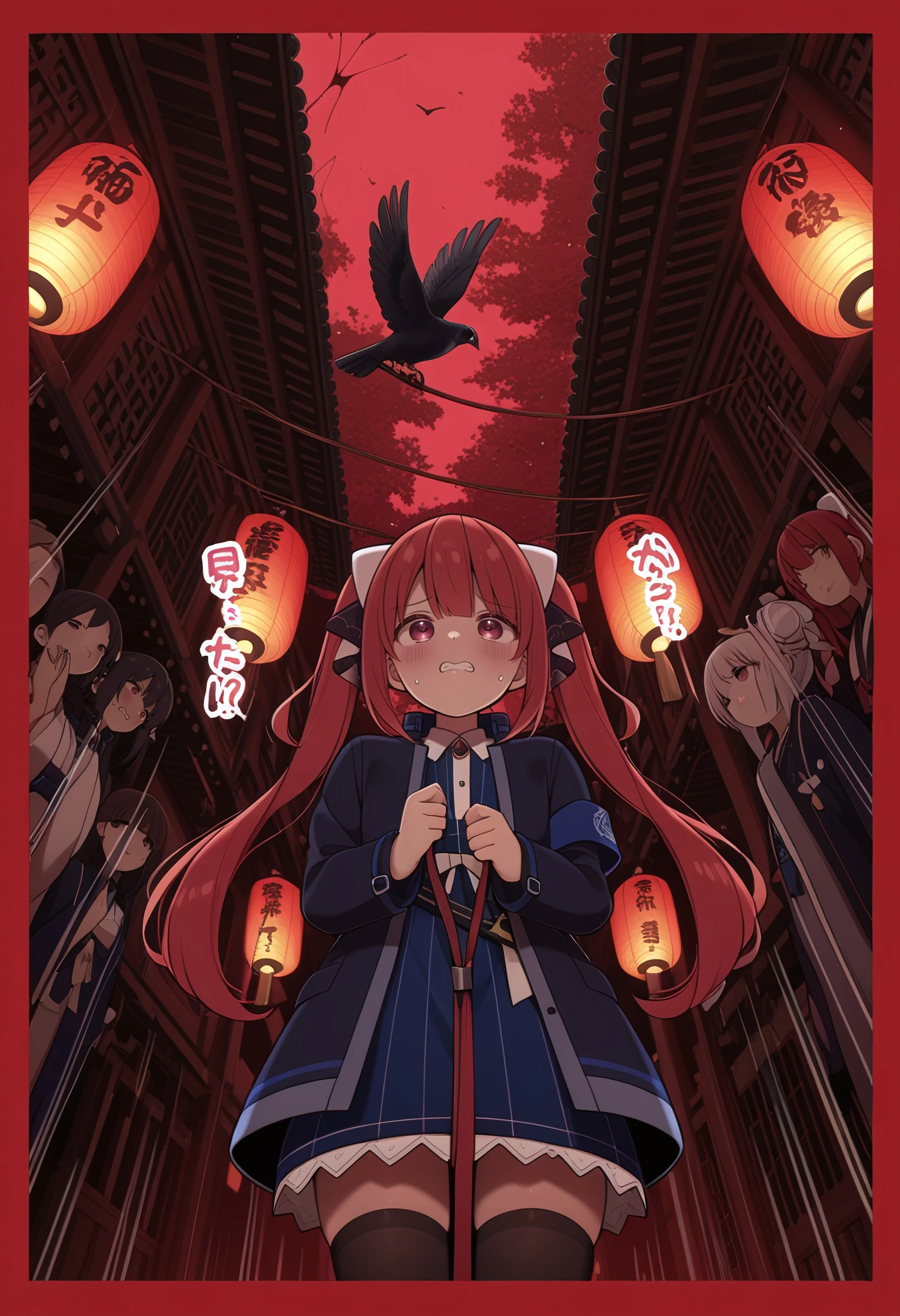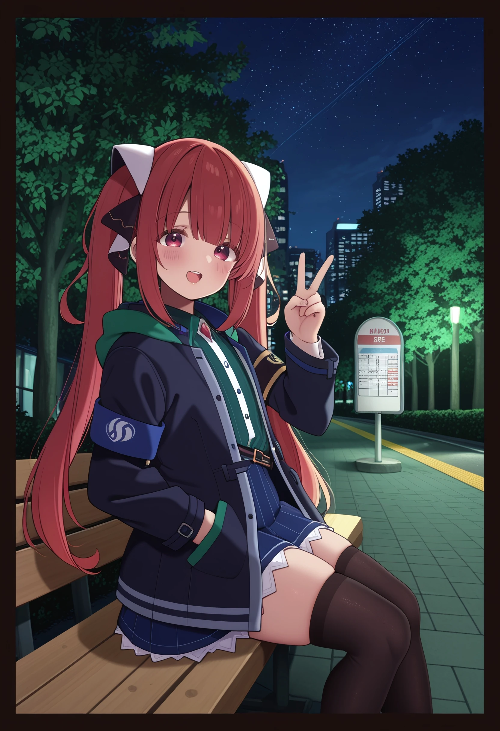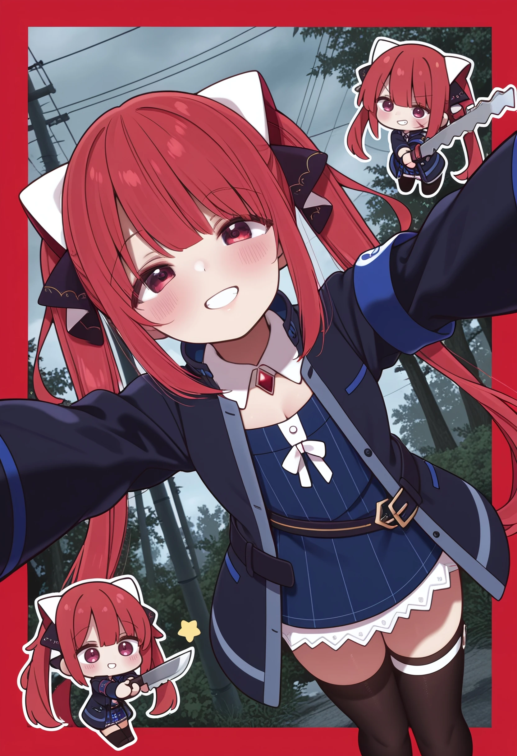 sofia_claudel, long_hair, blunt_bangs, twintails, hair_ornament, hair_ribbon, red_hair, red_eyes, pink_eyes, flat_chest, collared_shirt, blue_skirt, open_jacket, black_jacket, armband, zettai_ryouiki, black_thighhighs