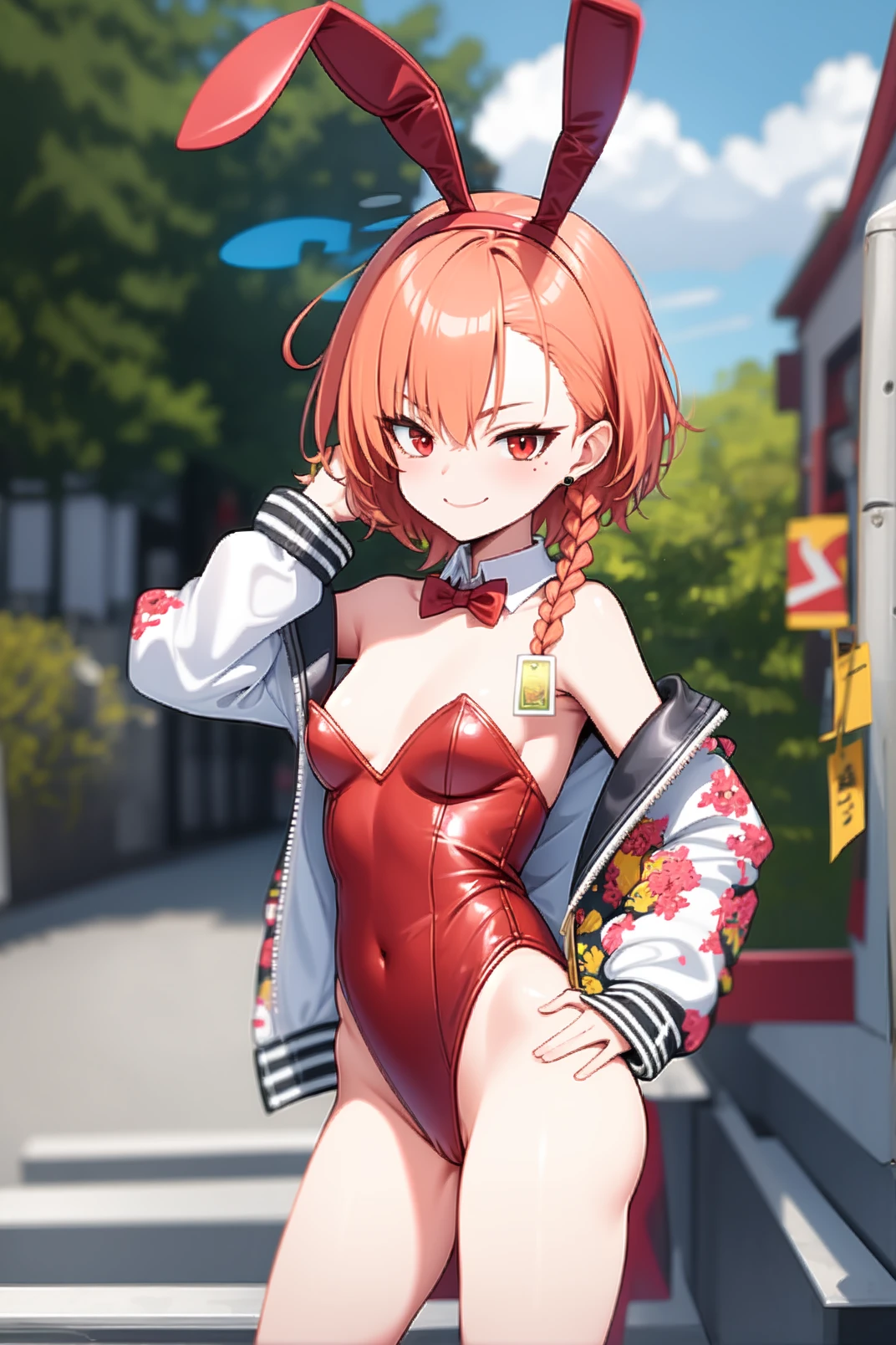 outfit: sukajan, print jacket, playboy bunny, red leotard, fake animal ears, bunny ears, detached collar, red bowtie