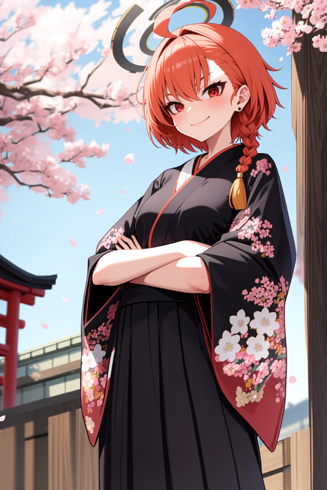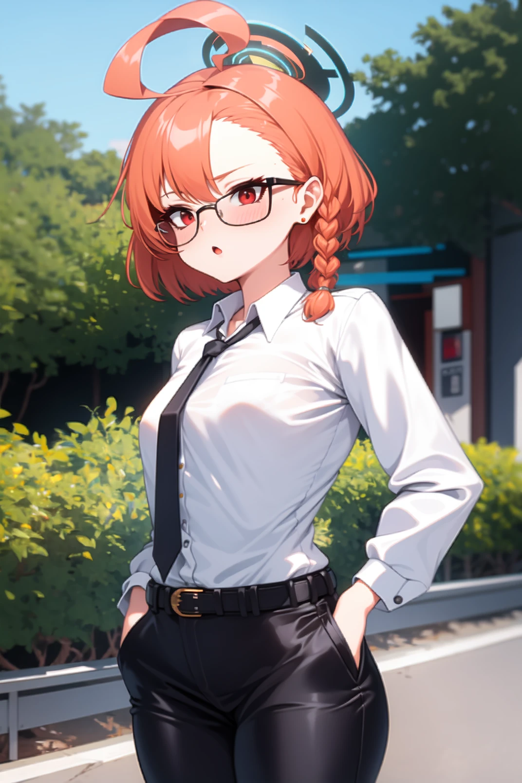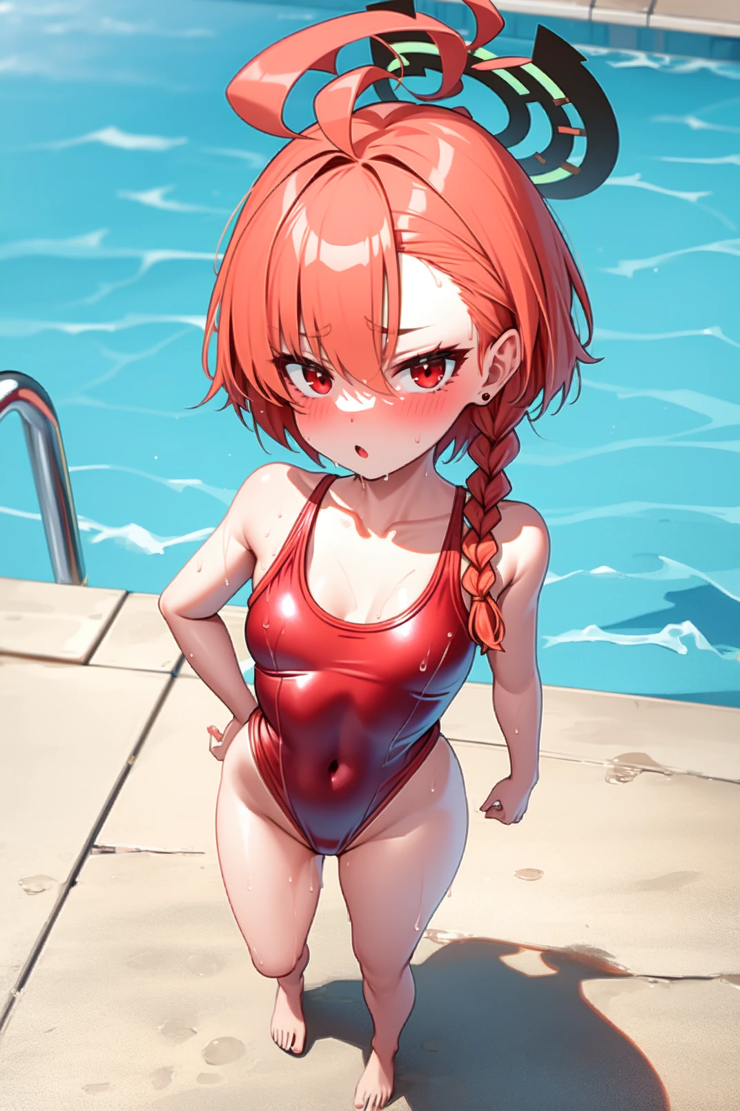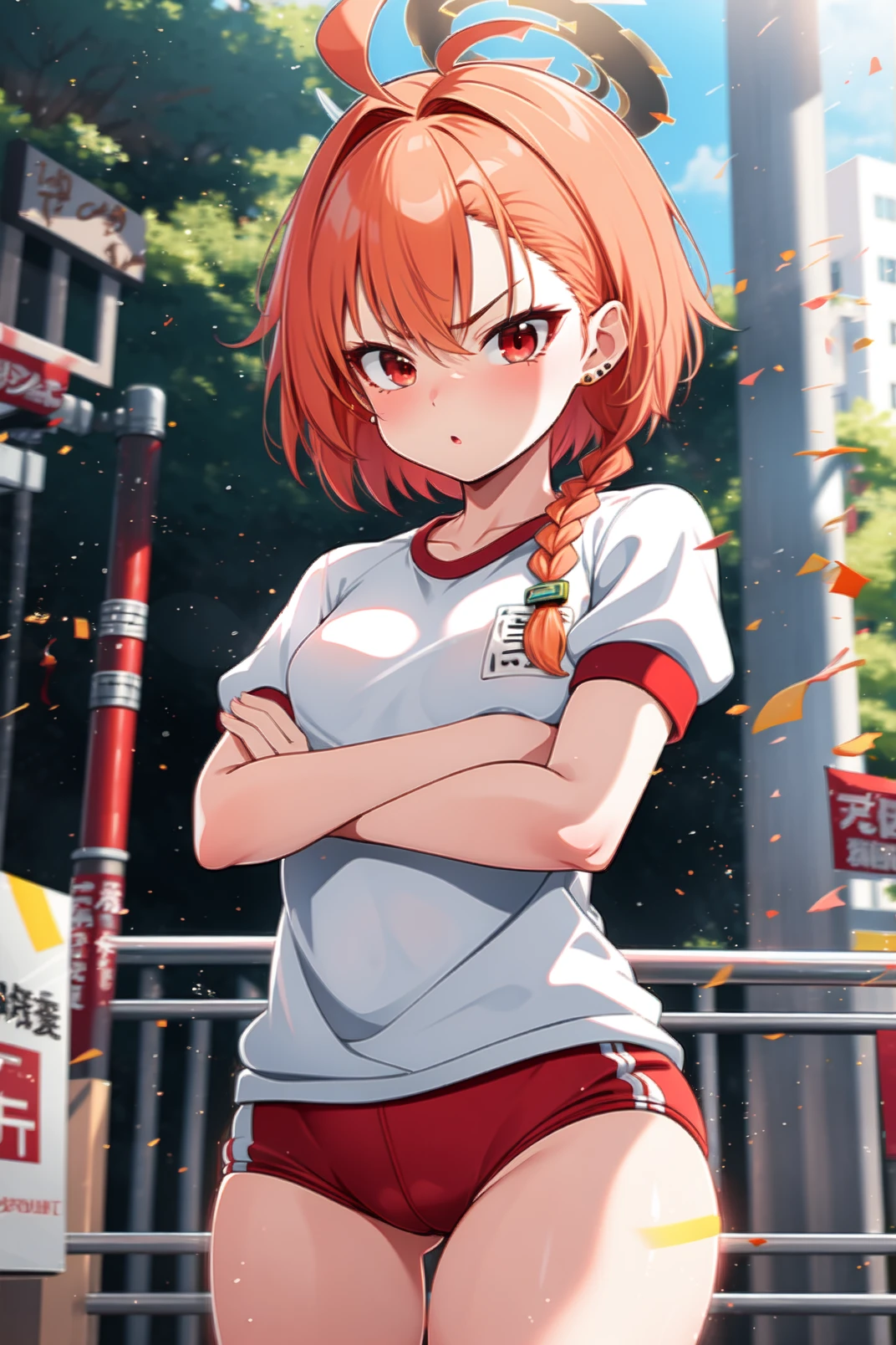 appearance: neru, red eyes, orange hair, short hair, huge ahoge, braid, single braid, stud earrings, halo