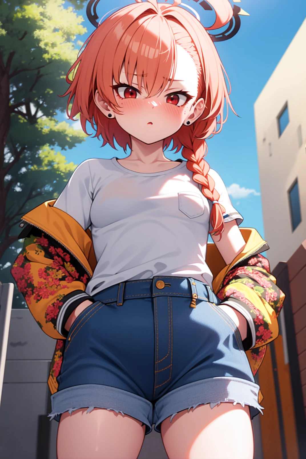 neru, red eyes, orange hair, short hair, huge ahoge, braid, single braid, stud earrings, halo