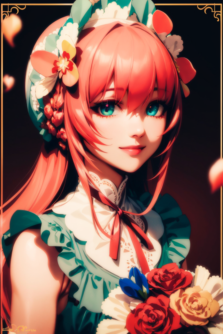 Prompt: ghostrickd, hair ornament, dress, animal ears, full body, braid, pantyhose, shoes, hair flower, petals, blush stickers, white pantyhose, bonnet
