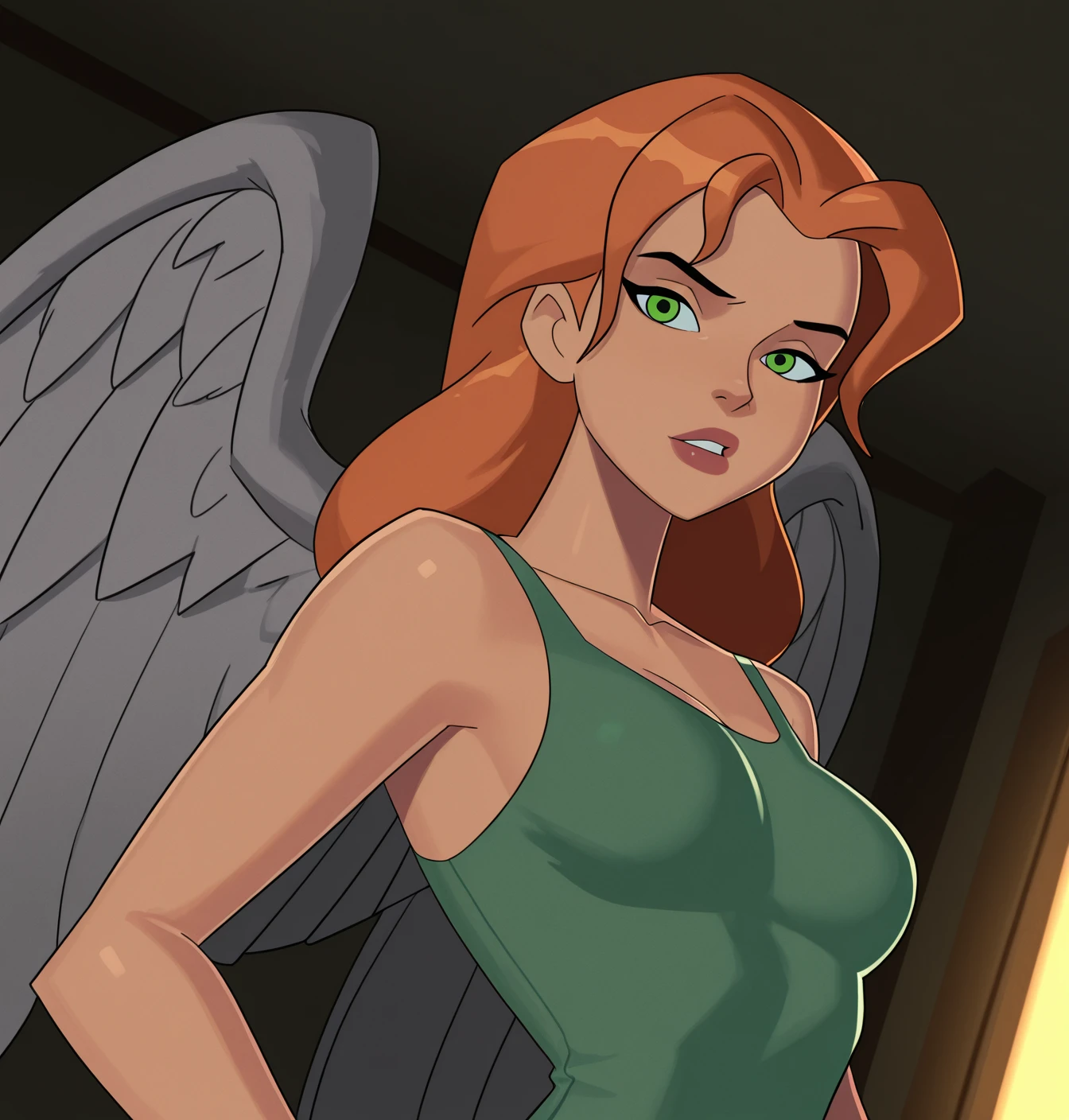 Hawkgirl (Shayera Hol): shayera hol, 1girl, solo, long hair, green eyes, medium breasts, bare shoulders, red hair, grey wings, crop top, angel wings, yellow shirt, yellow pants, black shirt, midriff, navel