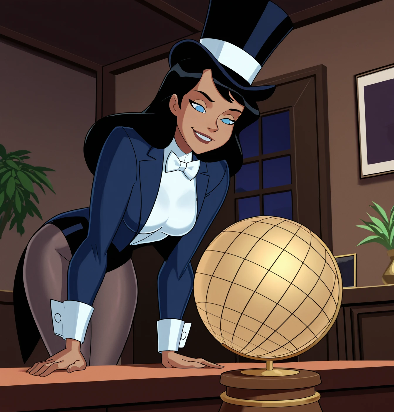 Zatanna Zatara: zatanna zatara, 1girl, solo, blue eyes, solid eyes, medium breasts, long hair, black hair, red lips, bow, jacket, bowtie, blue jacket, top hat, red lips, white bowtie, white bow