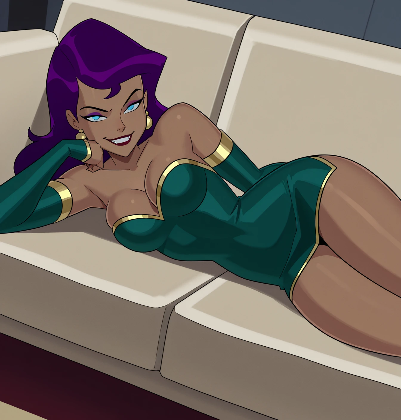 Circe: (c1rc3), 1girl, solo, long hair, medium breasts, solid eyes, blue eyes, short dress, cleavage, jewelry, bare shoulders, purple hair, earrings, lying, dark skin, dark-skinned female, makeup, lipstick, detached sleeves, thighs, green dress, black lips