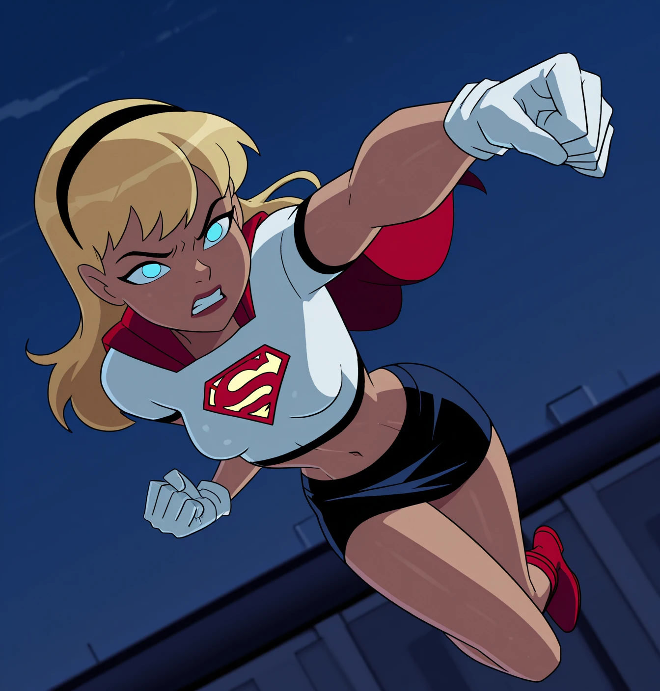 Supergirl: supergirl, 1girl, solo, blue eyes, solid eyes, small breasts, petite girl, long hair, blonde hair, short gloves, navel, midriff, white gloves, miniskirt, red cape, crop top, red cape, cropped shirt, white shirt, blue skirt, black hairband, jaggy lines, superhero, medium breasts