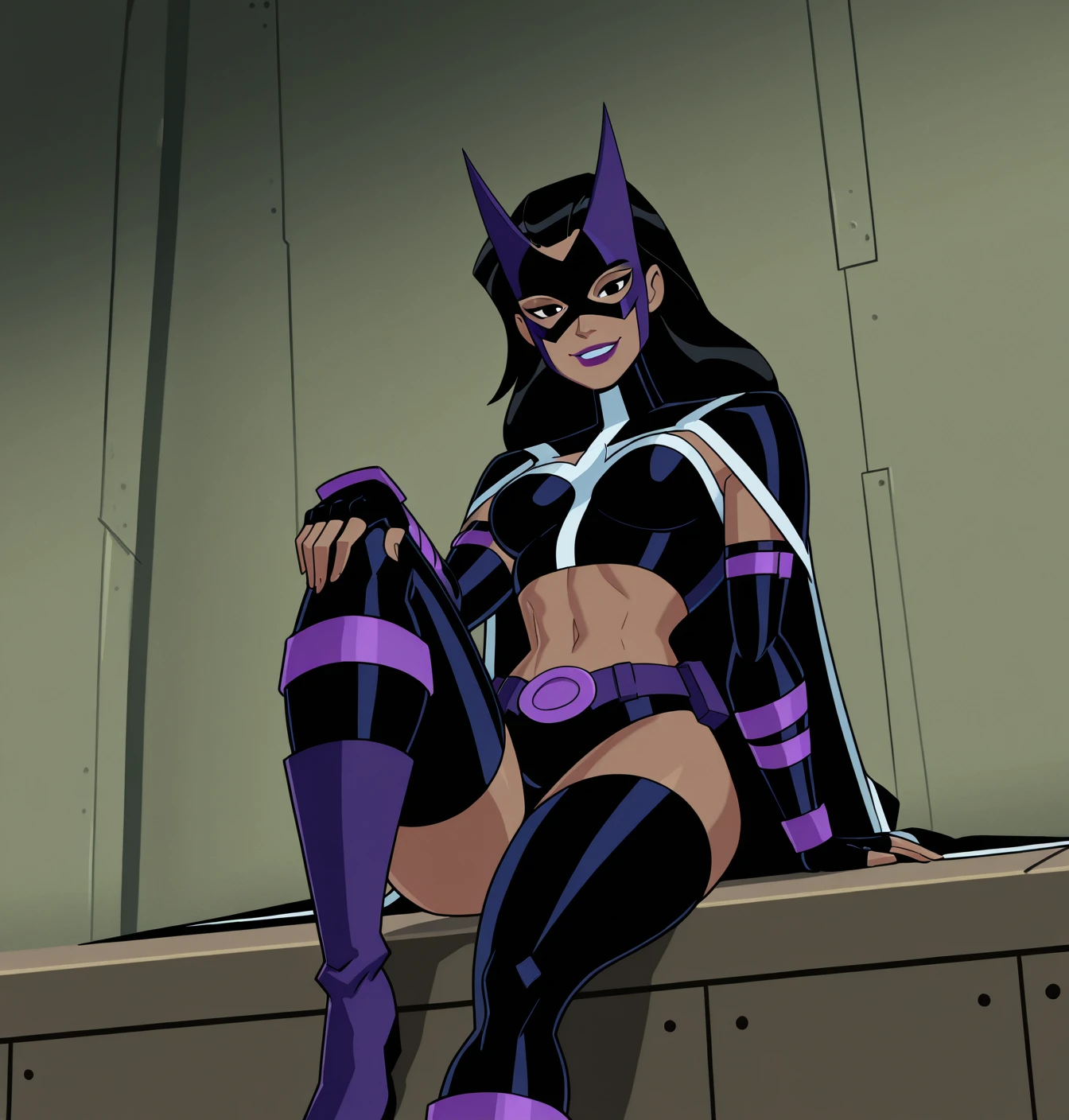 Huntress: huntress, 1girl, solo, black eyes, medium breasts, long hair, black hair, gloves, thighhighs, boots, elbow gloves, midriff, fingerless gloves, cape, crop top, makeup, mask, lipstick, superhero, purple lips, black gloves, black cape