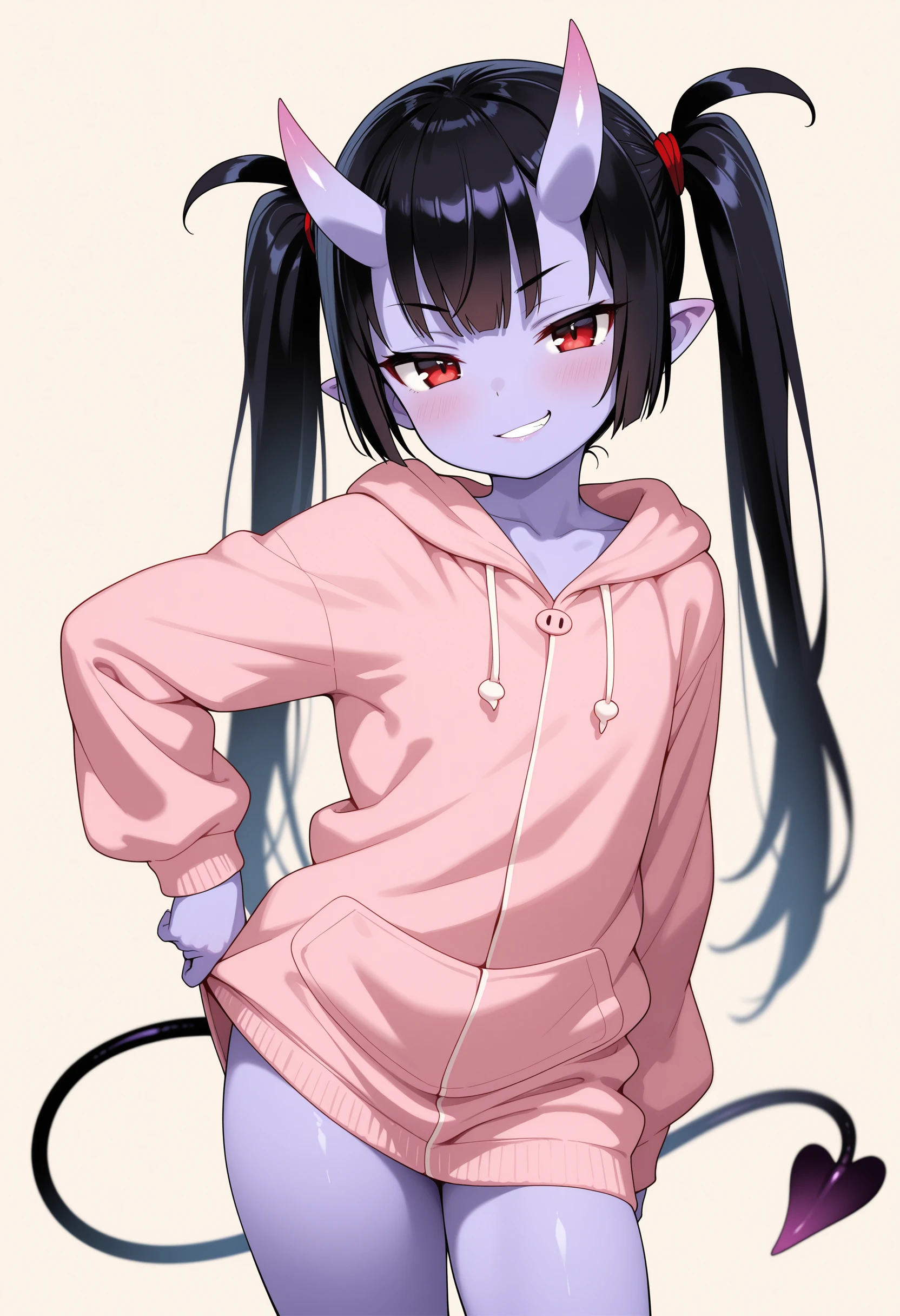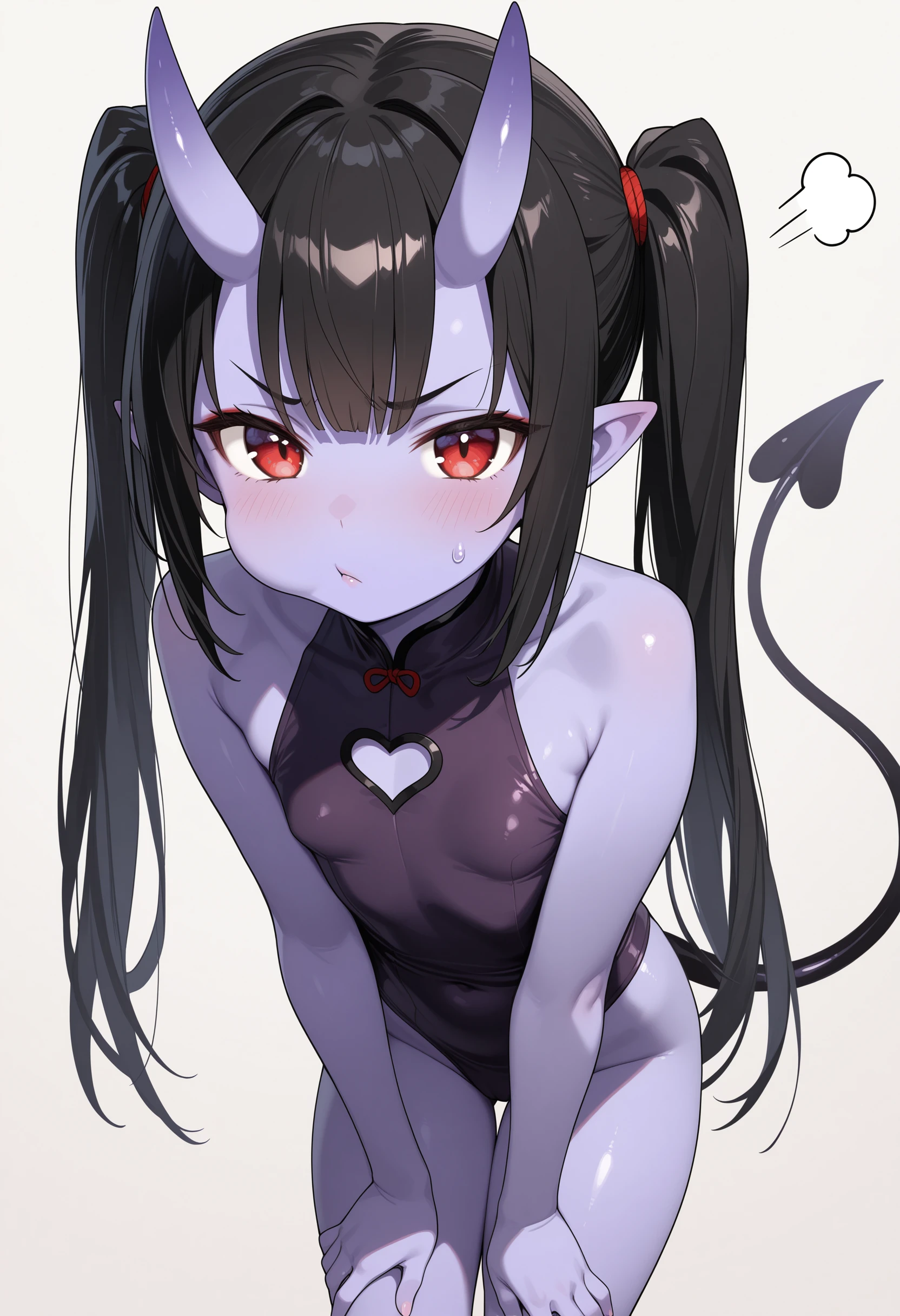 Simple Prompt: Purple Succubus, pointy ears, purple skin, black hair, oni horns, red eyes, demon tail, long hair, pigtails hair, simple background, parted lips,