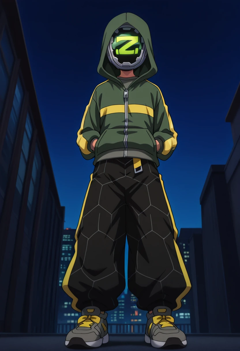 Hooded jacket: striped jacket, dark green hooded jacket, yellow strip, zipper pull tab, hood up,