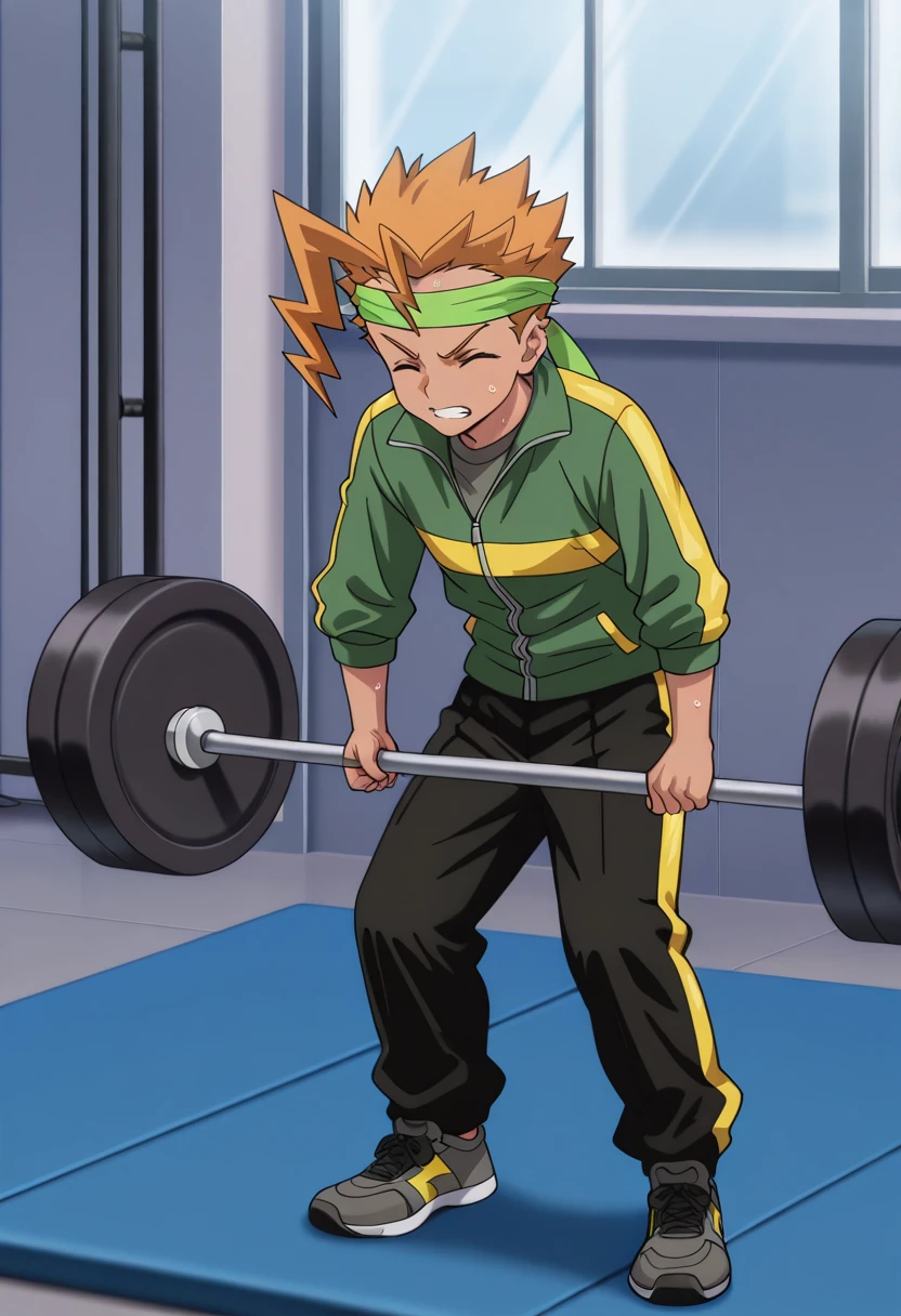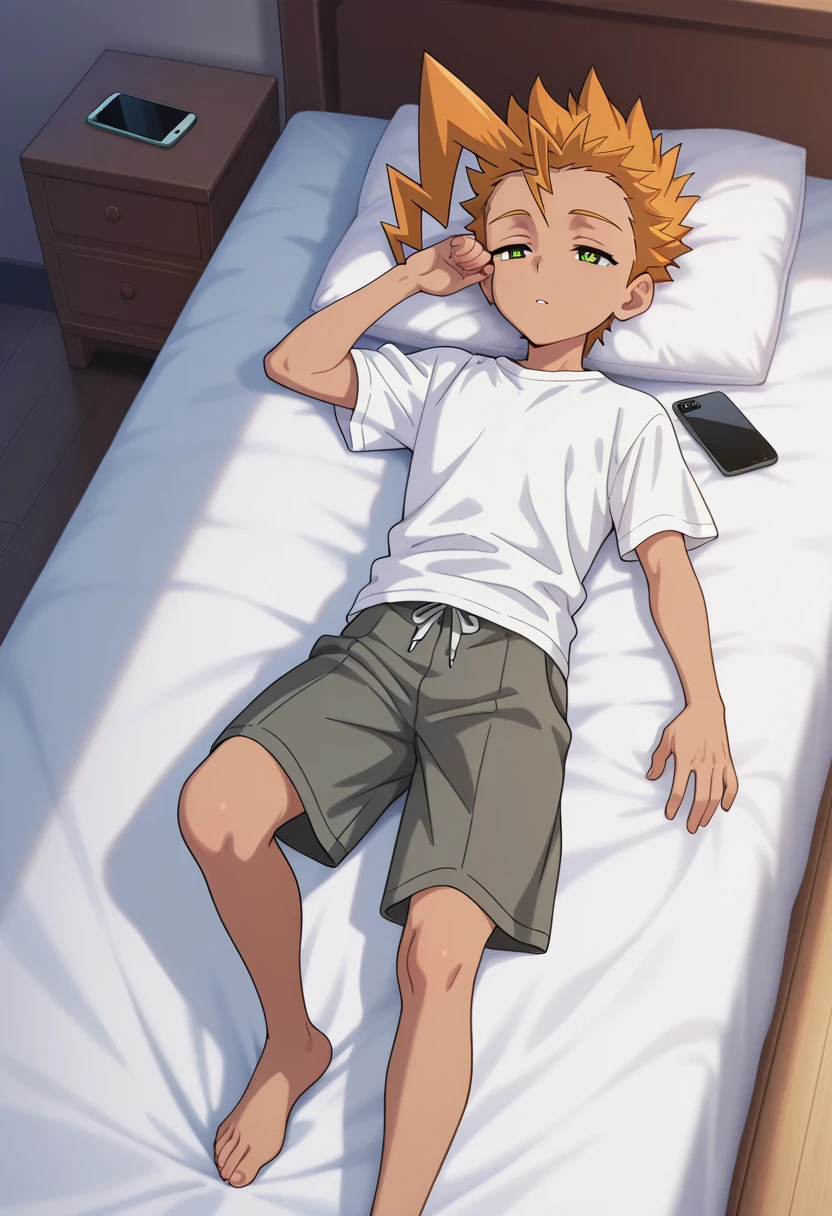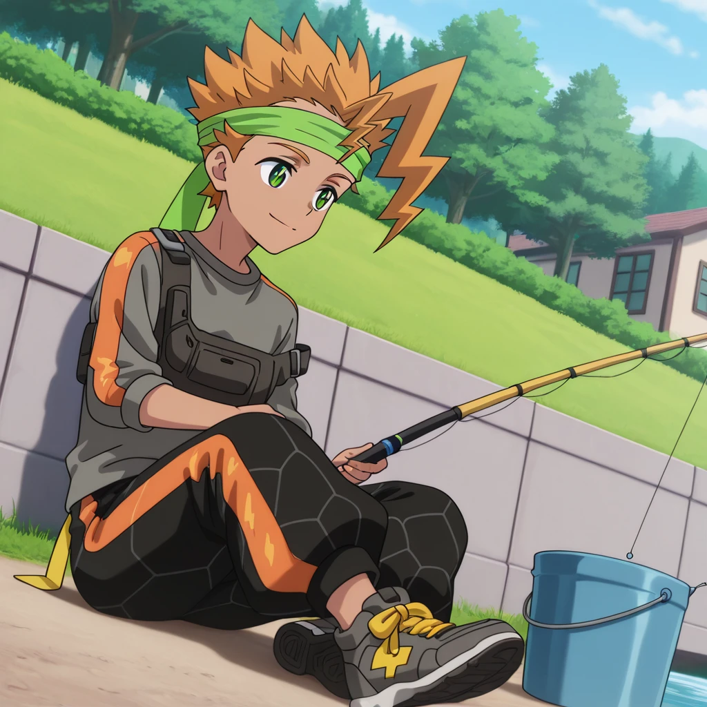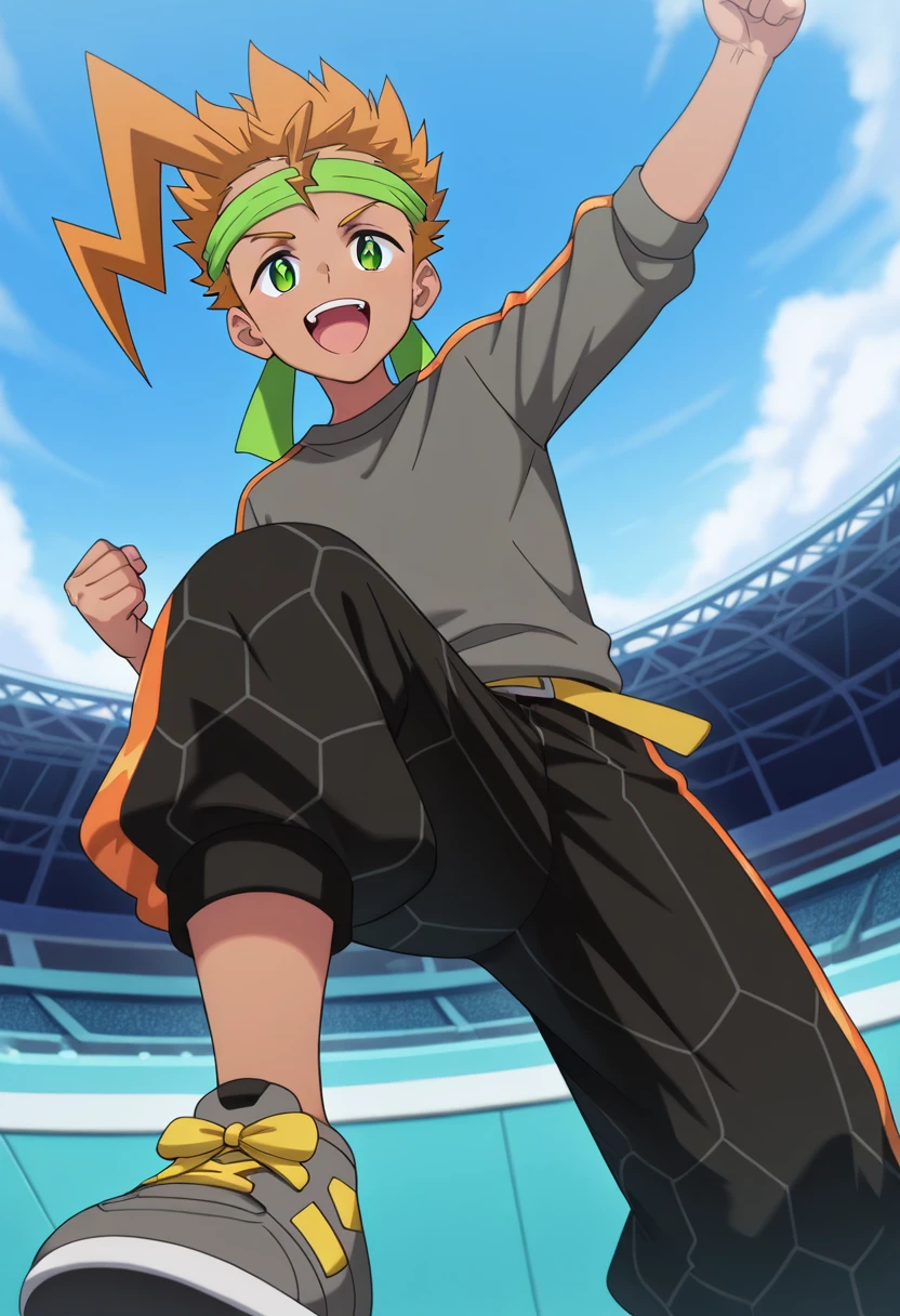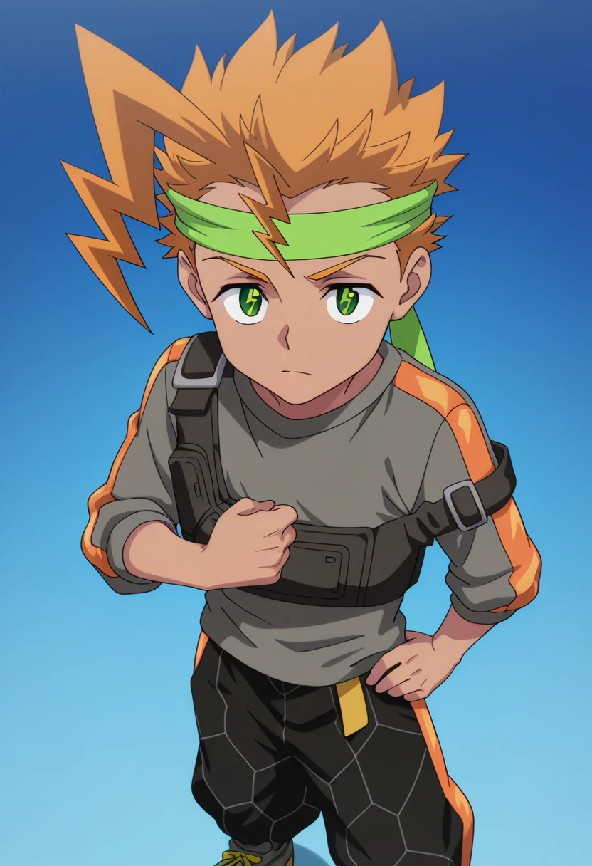 Base: bbx-shieru, dark skin, dark-skinned male, short hair, spiked hair, orange hair, lightning ahoge, green headband, green eyes, yellow pupils, lightning-shaped pupils,