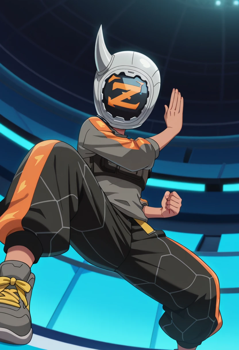 Main outfit: three-quarter sleeves, grey shirt, orange trim, yellow belt, black baggy pants, honeycomb (pattern), dark grey sneakers,