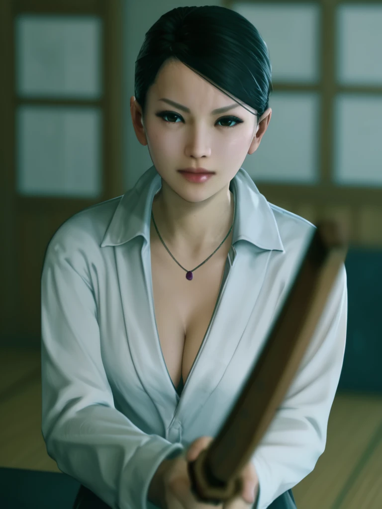 holding wooden katana,