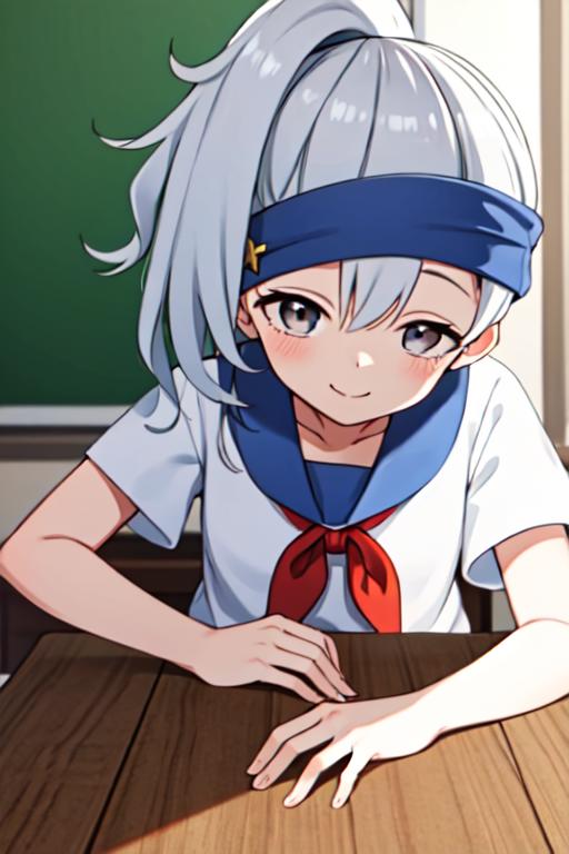 kunoichi_kikyou, grey eyes, grey hair, hair between eyes, ponytail, blue kimono, bike shorts, jingle bellFollow me on Twitter(X): @TakagiChikita