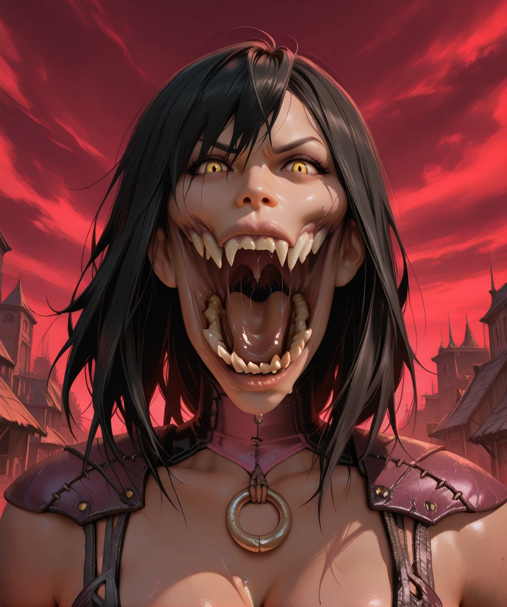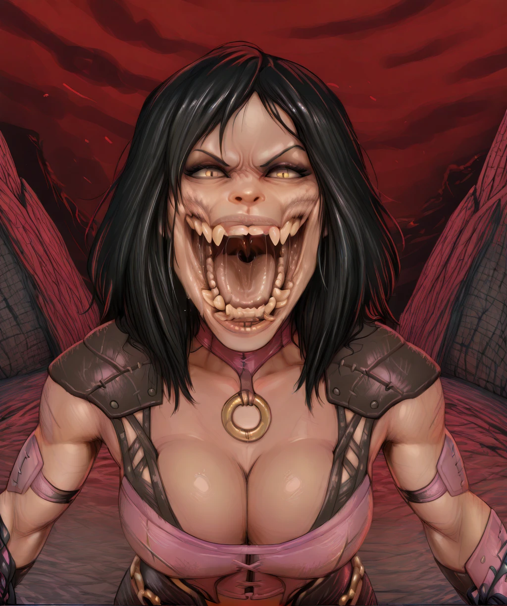 Mileena, black hair, medium hair, yellow eyes, slit pupils,- glowing eyes