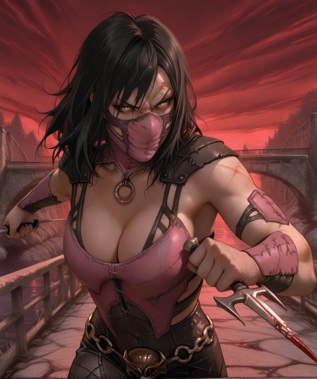 mouth mask, pink top, navel, cleavage, o-ring, stitched, leather armor, tight black pants, - sash, or pelvic curtain,
