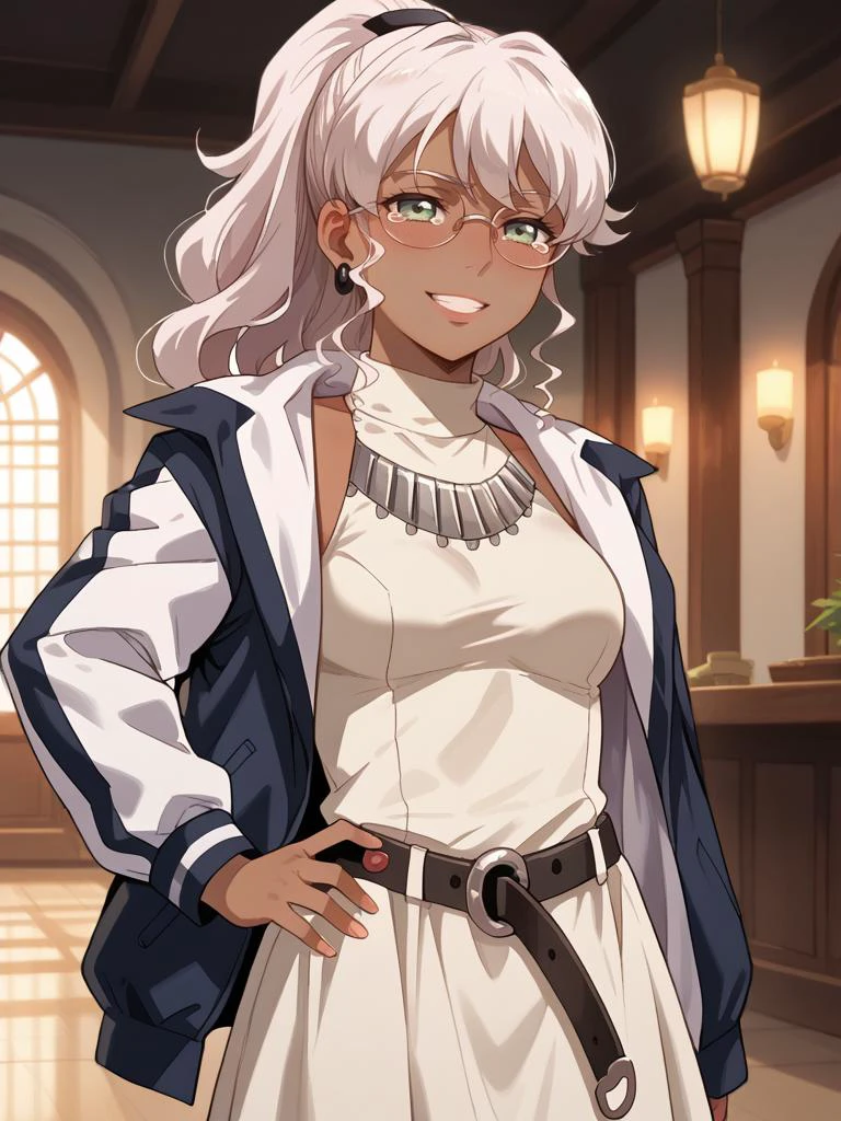 naomi,dark skin, white hair,bangs, high ponytail,wavy hair, dark green eyes,glasses, semi-rimless eyewear
