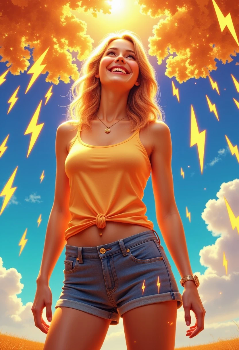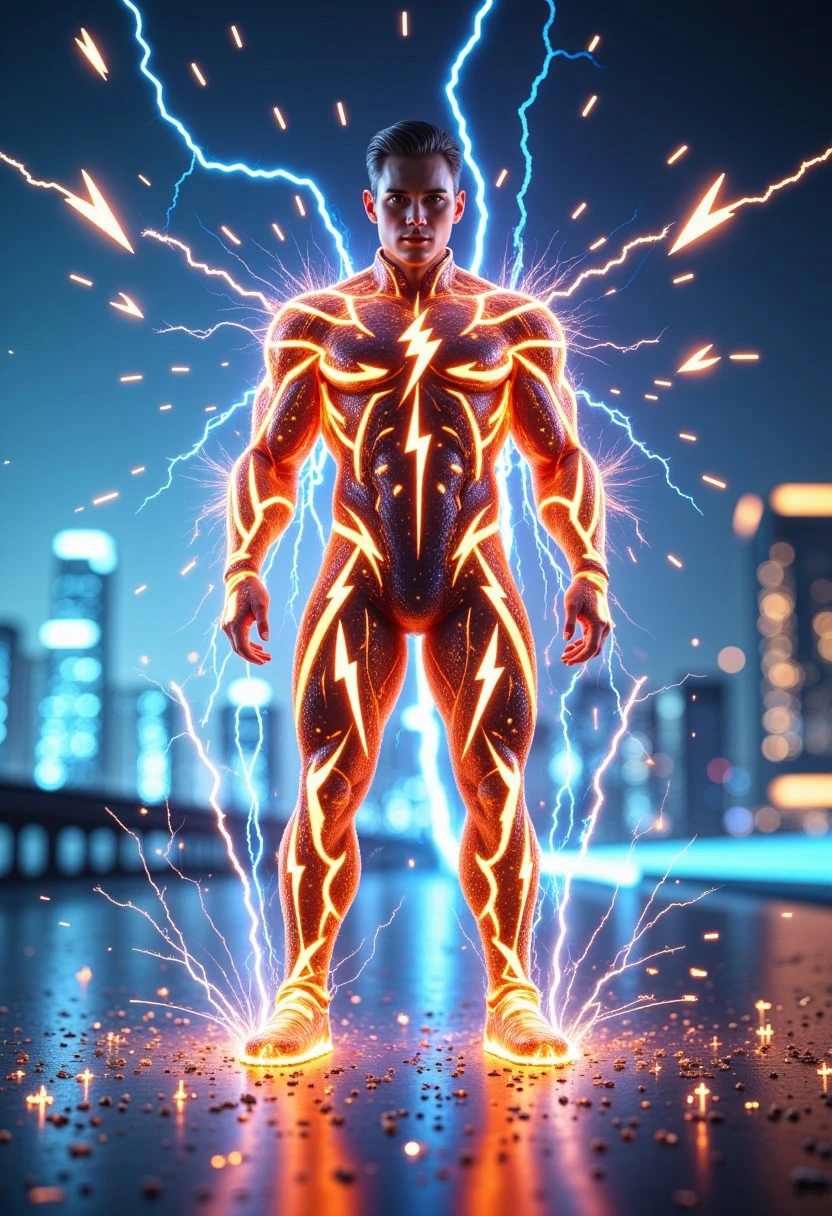 Examples: (tiny/small) stylized lightning bolt symbols, electricity, electric, lightning, lightning bolts, electric energy, glowing, bright, power, sparks, glowing sparks, the word "BUZZ", orange, blue, 3D - And combinations of them.