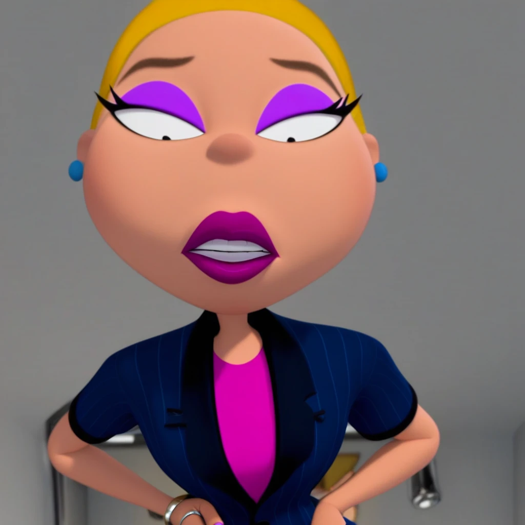Charlotte, 1girl, black eyes, purple eyeshadow, blonde hair, ponytail, thick lips, blue earrings, dark blue suit and dress pants, rolled up sleeves, ring on finger, pink undershirt, black heels