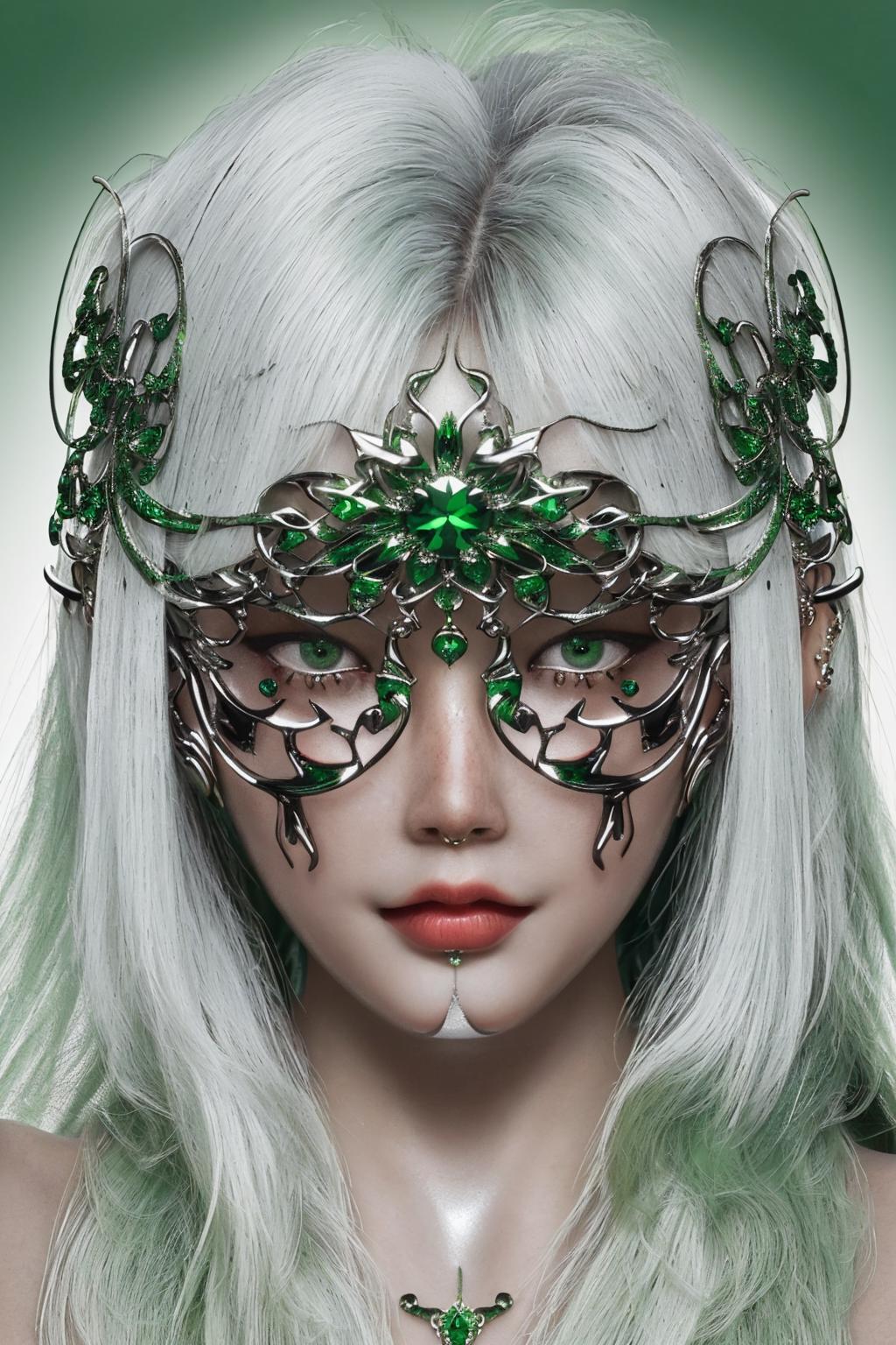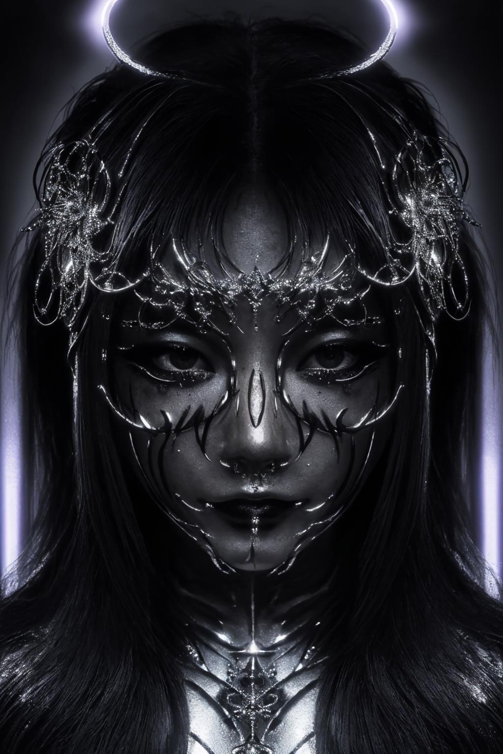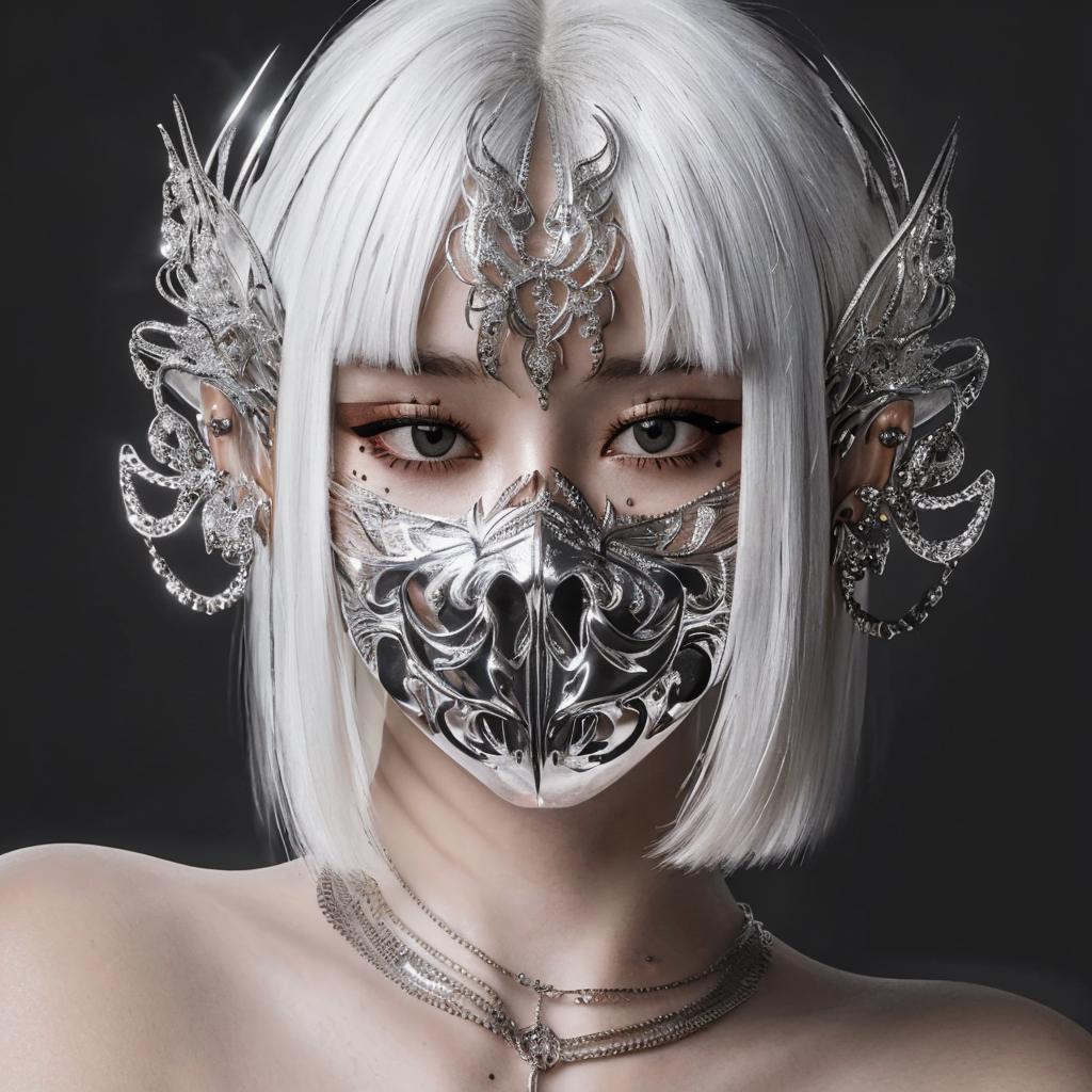 Trigger words: chrometype, chrome effect, (metal ornaments covering eyes), (metal chrome ornaments, metal chrome facewear:1.4)