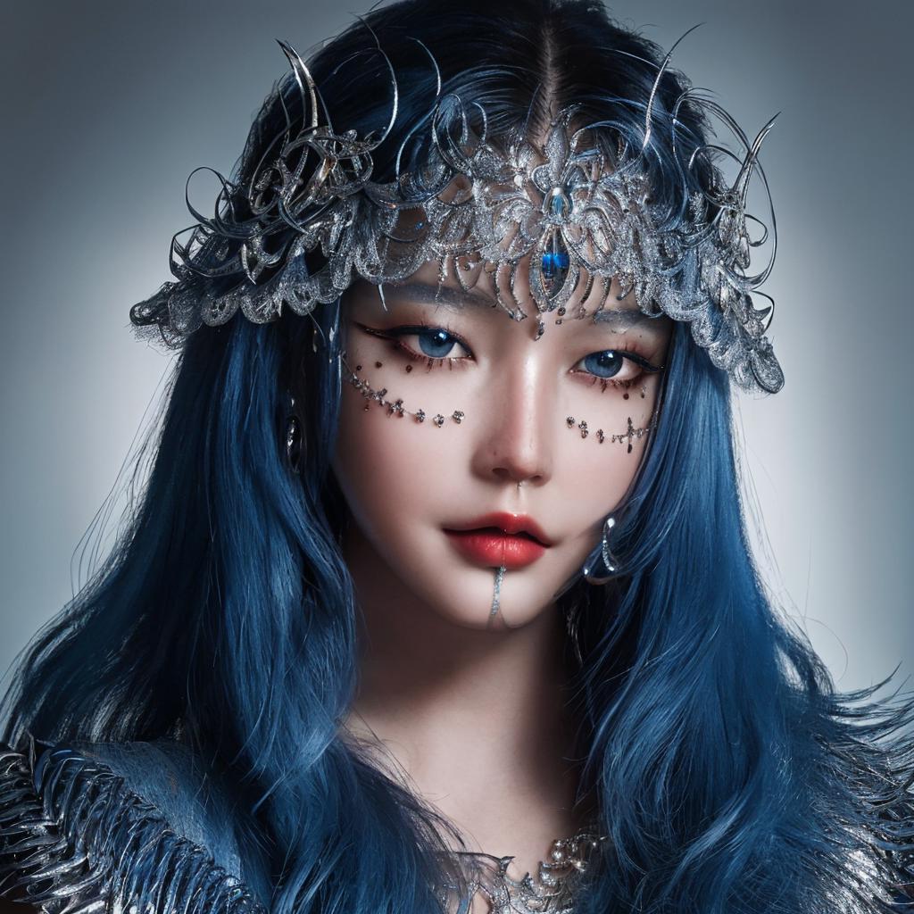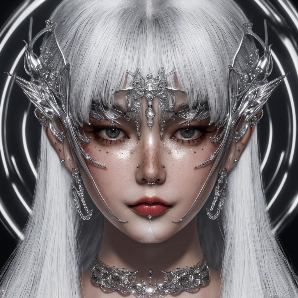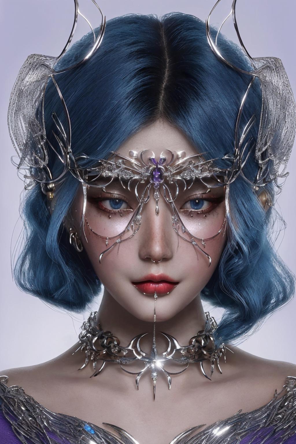 Trigger words: chrometype, chrome effect, (metal ornaments covering eyes), (metal chrome ornaments, metal chrome facewear:1.4)