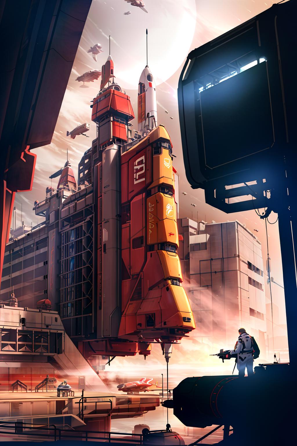 (space), (universe), (galaxy), stars, milky way, (planets), black hole, (accretion disk), crane_(machine), mecha, castle, robot, scenery, science_fiction, labcoat, cable, monitor, screen, buildings, wide shot, scenery, aircraft, military_vehicle, (halo), airplane, vehicle_focus, spacecraft, (no name), (no signatures)