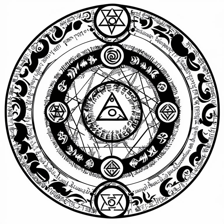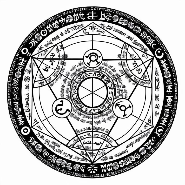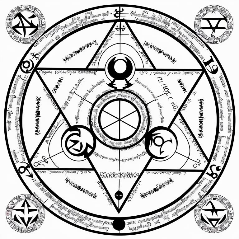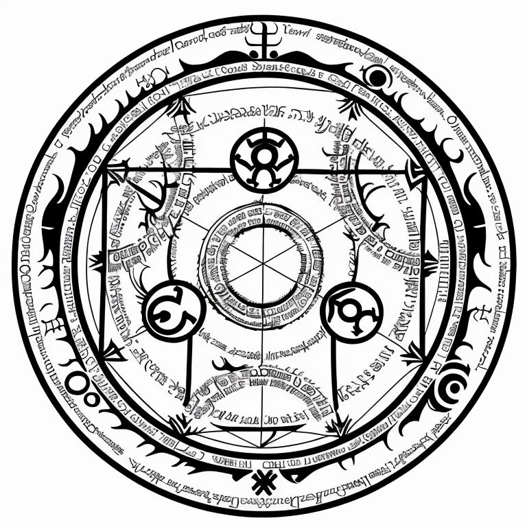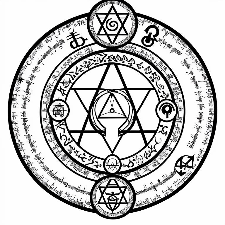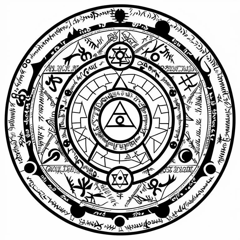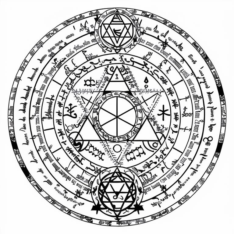 • nvjobmagiccircle magic summoning circle, various symbols, pentagramus, white background, intricate