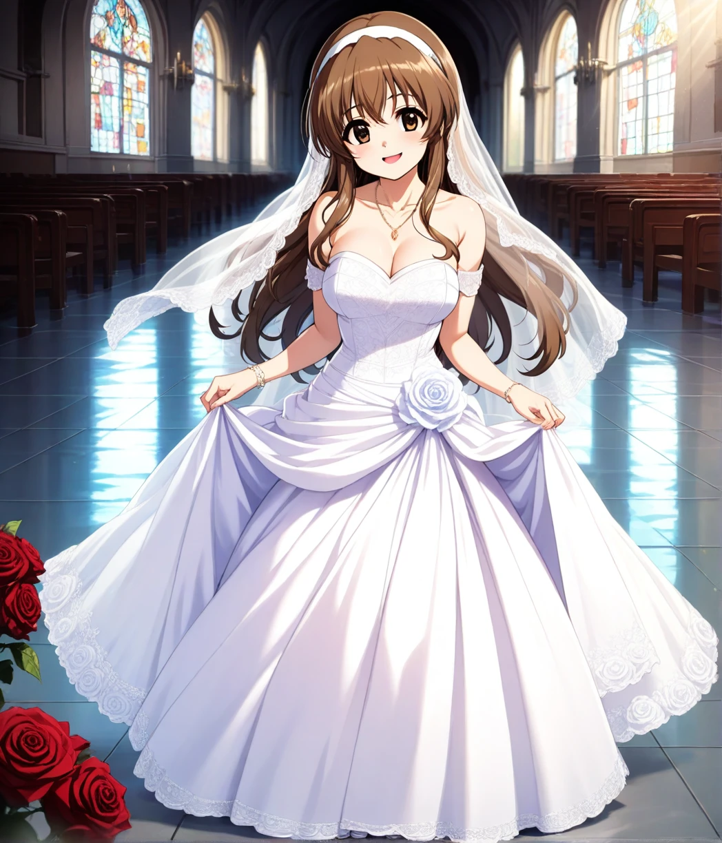 wedding dress, breasts, dress, veil, bridal veil, jewelry,white dress, rose, cleavage, flower,bride, bare shoulders, necklace, collarbone, :d, strapless dress, strapless