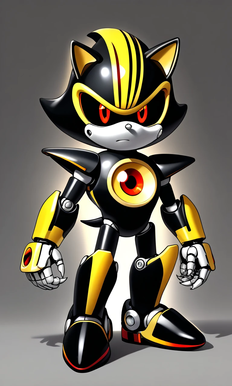Metal Sonic 3.0, robot, metal skin, black skin, yellow stripe on head, black sclera, red pupils, claws, black shoes