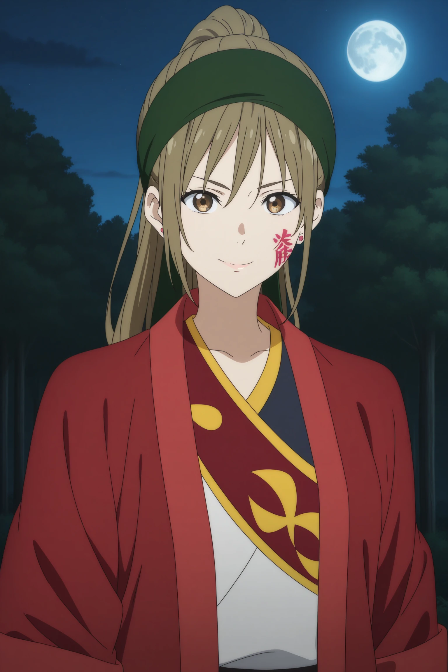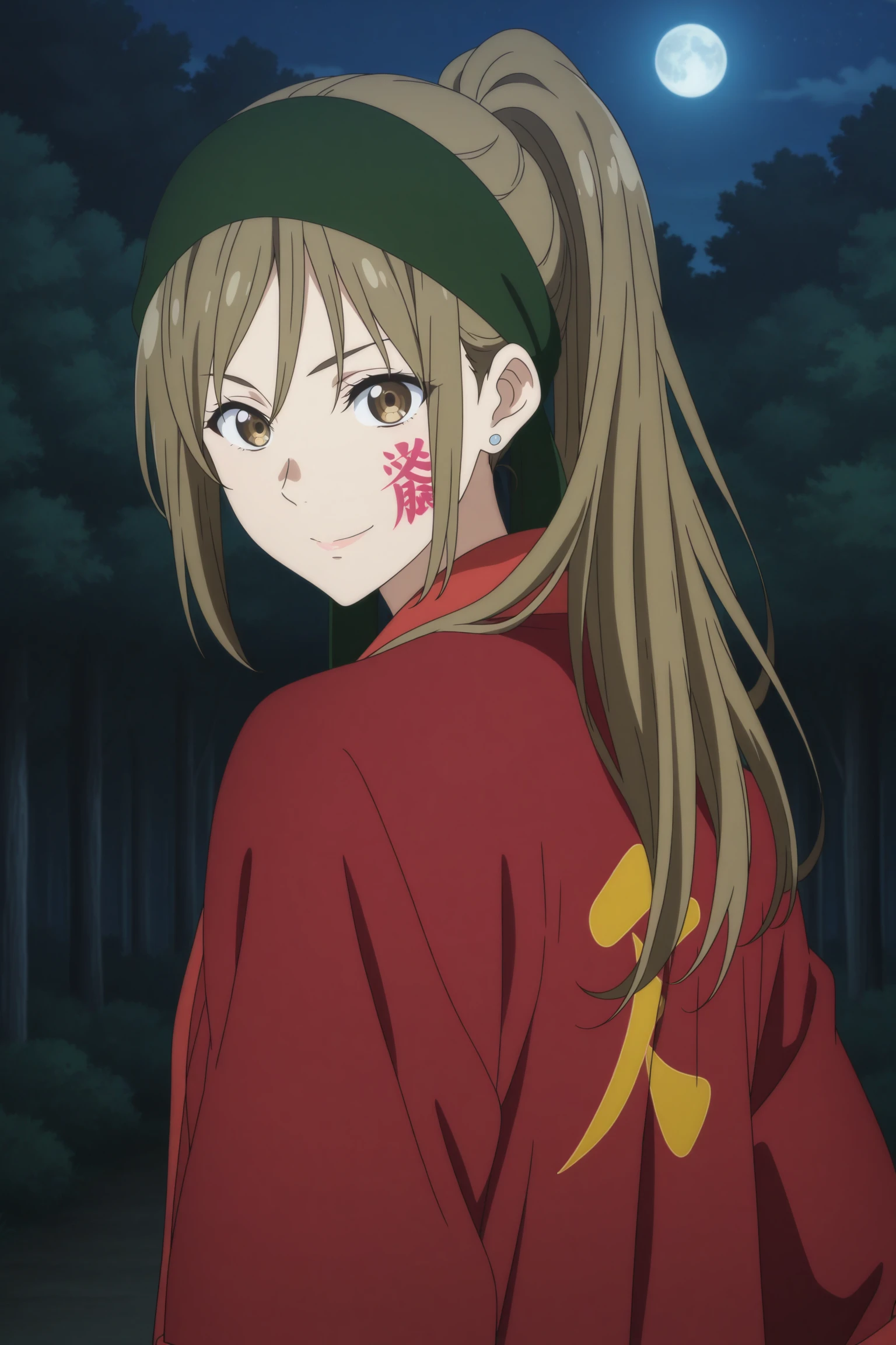 ninomiya shizuku, long hair, brown hair, ponytail, asymmetrical sidelocks, wispy bangs, hachimaki, brown eyes, body writing, facepaint, stud earrings, japanese clothes, happi, long coat, red coat, open coat, multicolored shirt, black pants, white footwear, jika-tabiOutfit 4 (Green Jacket)