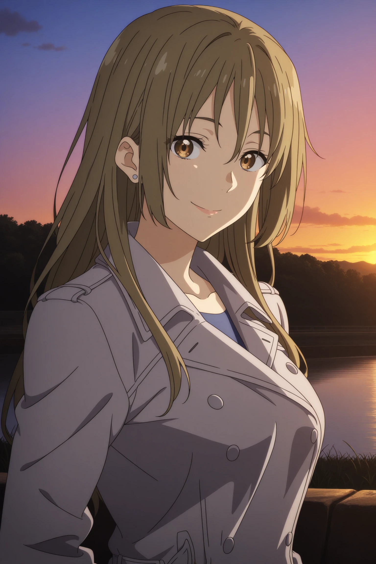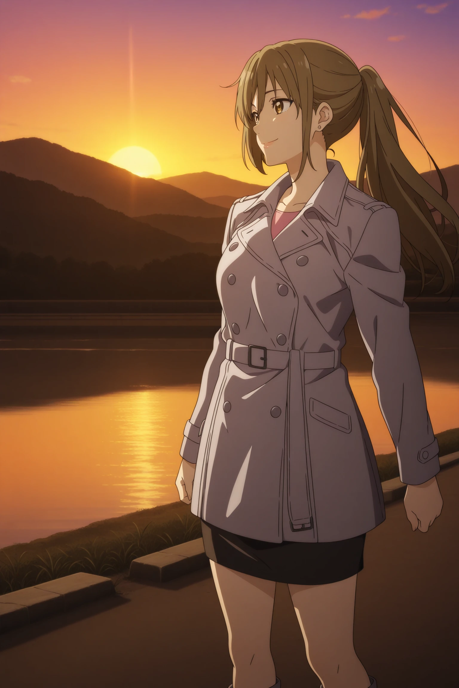 ninomiya shizuku, long hair, brown hair, asymmetrical sidelocks, wispy bangs, brown eyes, stud earrings, three-quarter sleeves, white sleeve cuffs, brown jacket, aqua vest, vertical-striped vest, brown skirt, pencil skirt, black pantyhose, black footwear, high heelsOutfit 2 (Trench Coat)