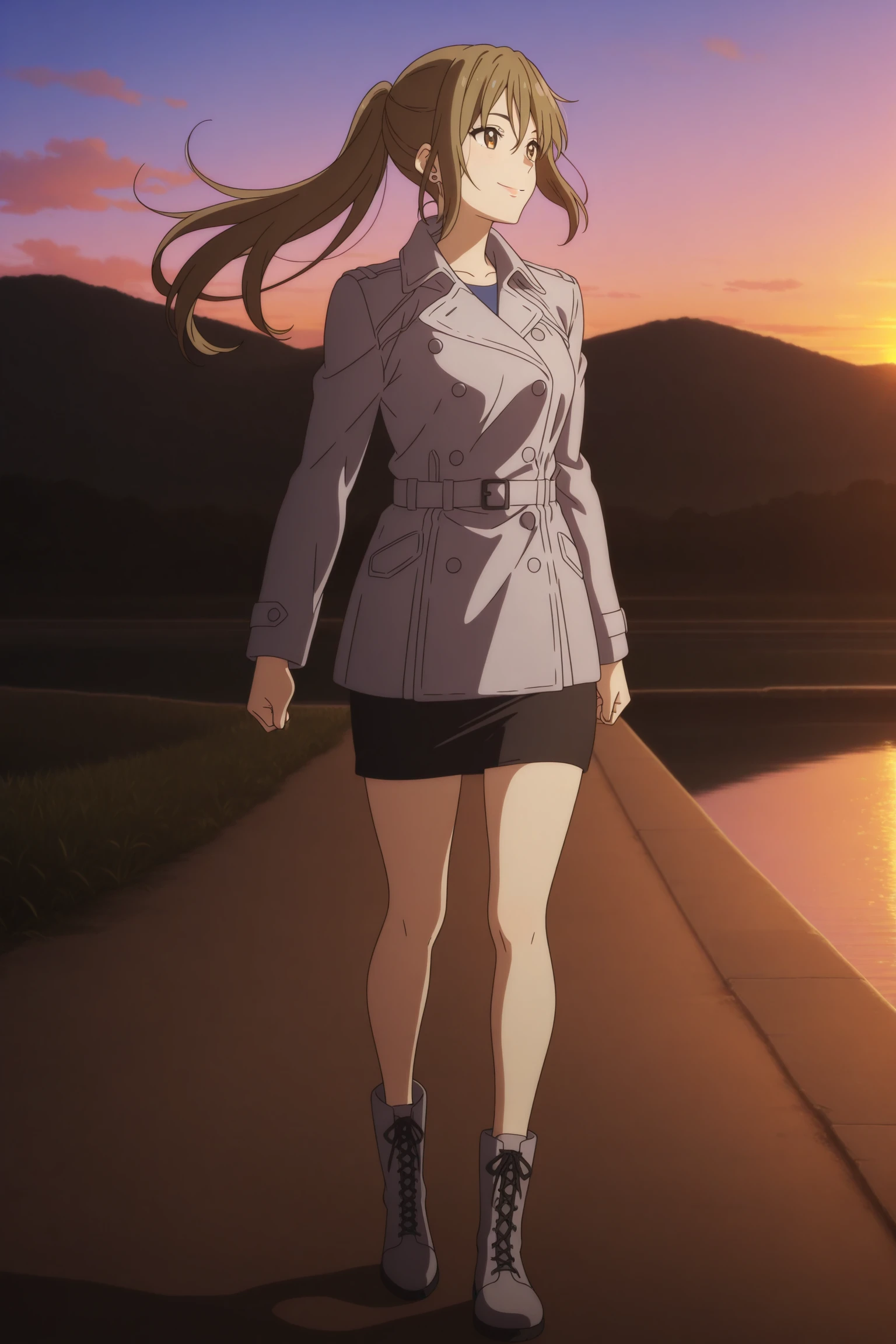ninomiya shizuku, long hair, brown hair, asymmetrical sidelocks, wispy bangs, brown eyes, stud earrings, long sleeves, grey coat, trench coat, double-breasted, blue shirt, black skirt, pencil skirt, grey footwear, bootsOutfit 3 (Happi)