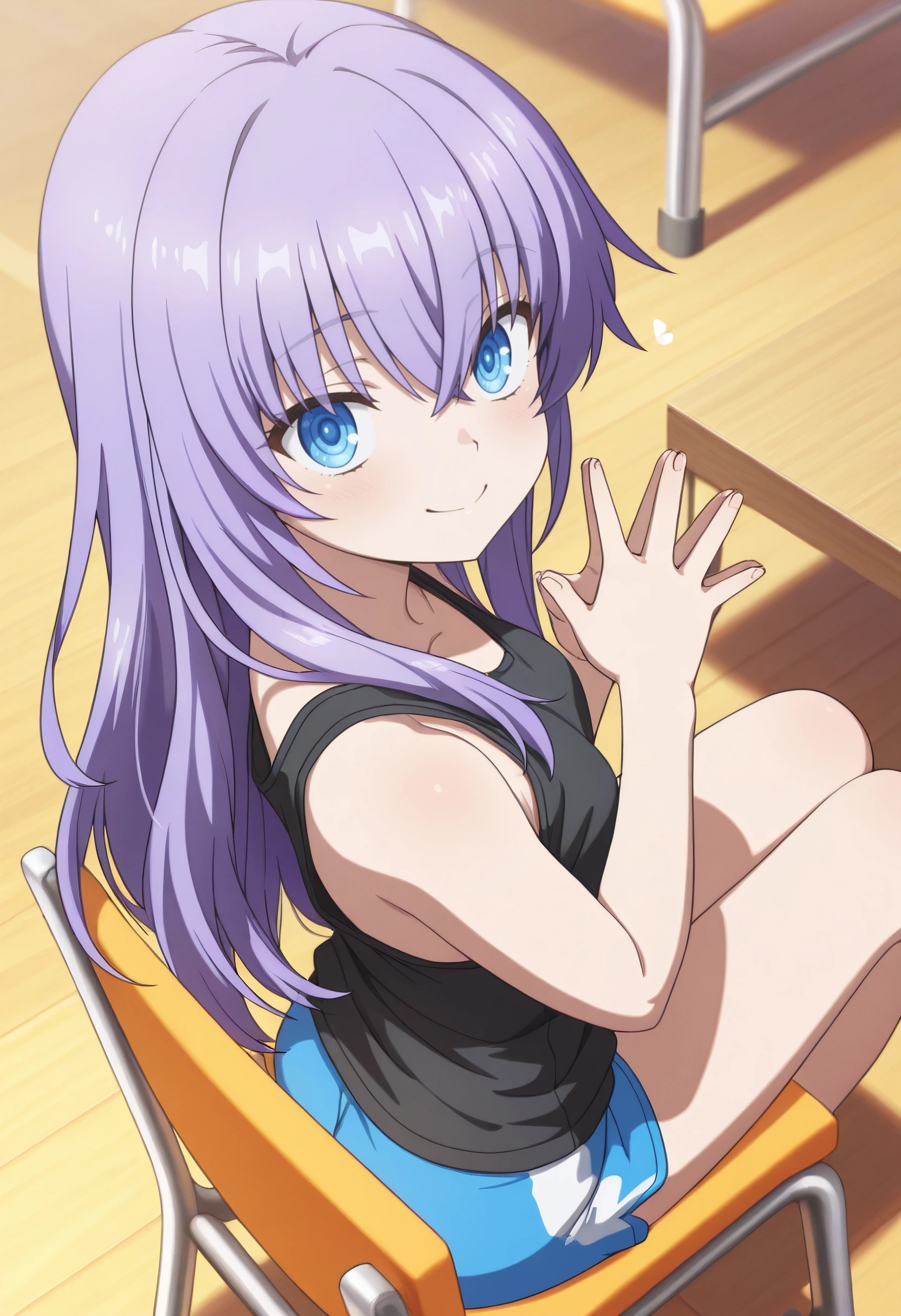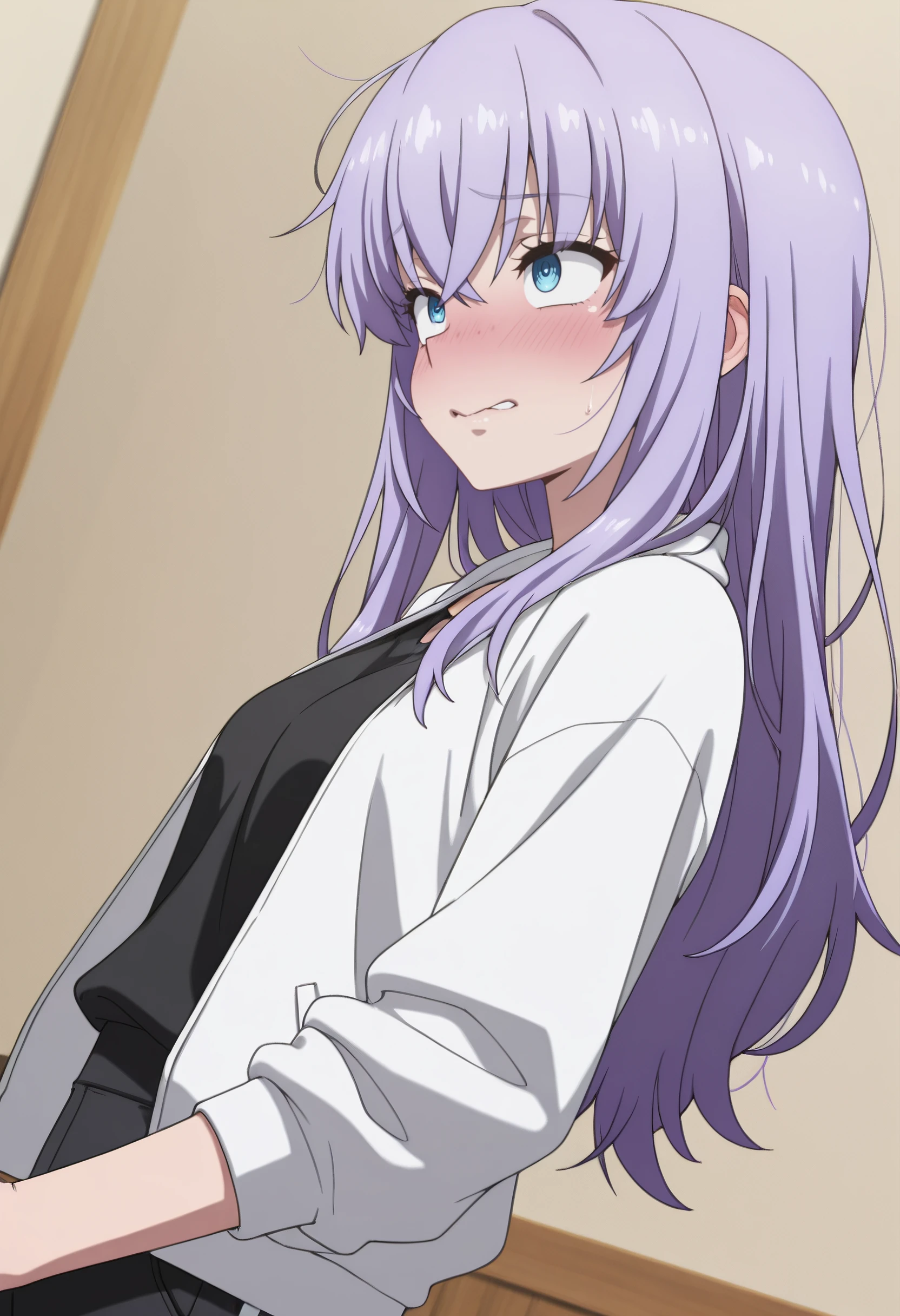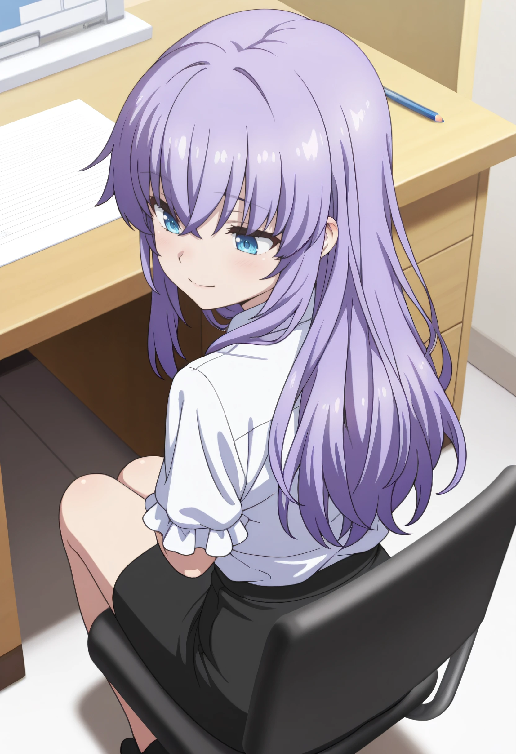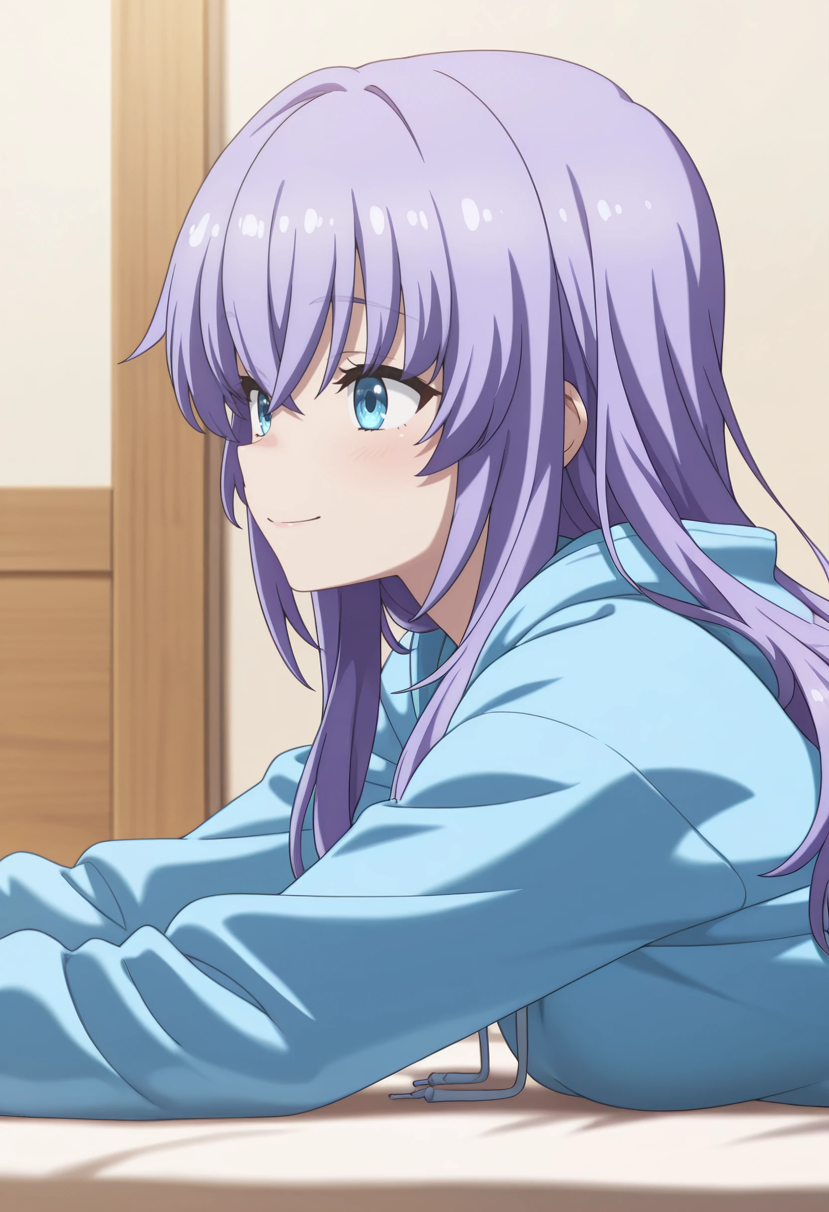 SPoAi, long hair, purple hair, hair between eyes, hair down, blue eyes, sidelocks, crossed bangs,